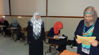 في اول ايام امتحانات تفقدت السيدة رئيس قسم الكيمياء المحترمة قاعة الامتحان لطالبات الدراسات العليا (ماجستير) ومتابعة الزي الموحد المحتشم والتي بدأت 29/آيار/2014.