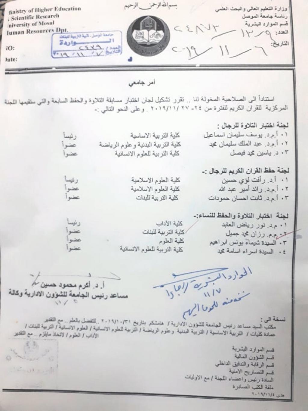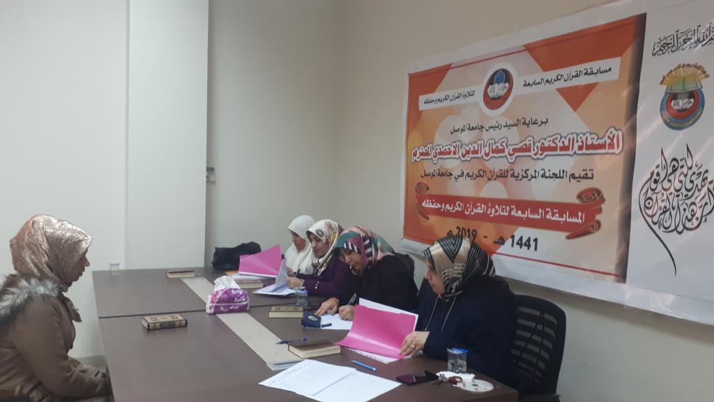 اختتمت يوم الخميس الموافق 28 تشرين الثاني 2019 المسابقة المركزية السابعة لتلاوة القرآن وحفظه، والتي تمت برعاية السيد رئيس جامعة الموصل الاستاذ الدكتور قصي كمال الدين الاحمدي، وبمشاركة تدريسيين من الكلية في لجنة التحكيم، وهما: الدكتور ثابت احسان حمودات التدريسي في قسم التربية البدنية وعلوم الرياضة والمدرس المساعد رزان محمد جميل التدريسية في قسم علوم القرآن والتربية الاسلامية، فضلاً عن استضافة كلية التربية للبنات لجنة تحكيم المسابقة الخاصة بالنساء التي بدأت منافساتها من يوم 25 تشرين الثاني 2019 ولمدة اربعة ايام متتالية، وتكونت لجنة اختبار حفظ القرآن الكريم من الاساتذة:- أ.د. رأفت لؤي حسين رئيساً- أ.م.د. رائد أمير عبدالله عضواً- م.د. ثابت احسان حمودات عضواً