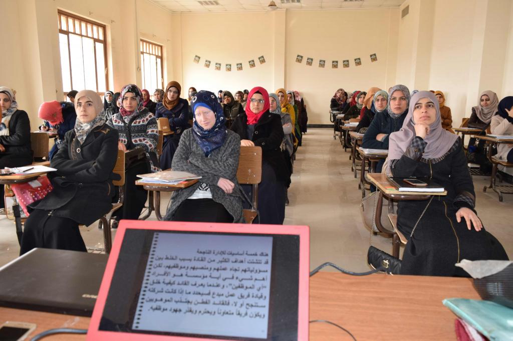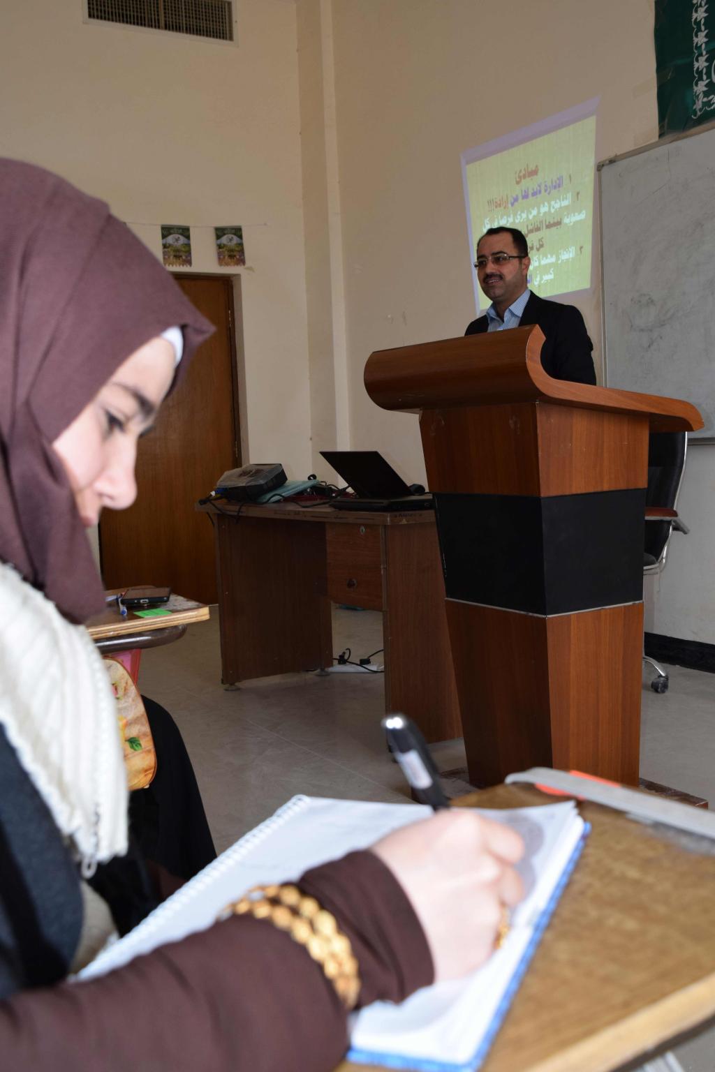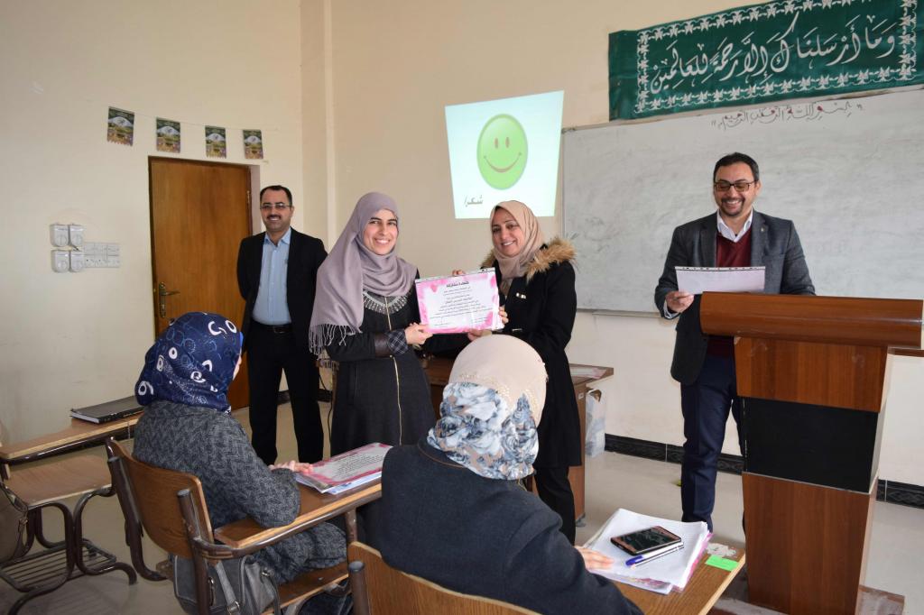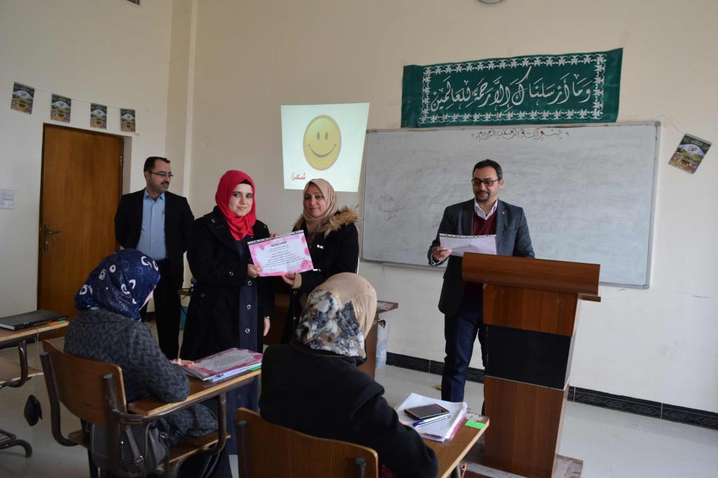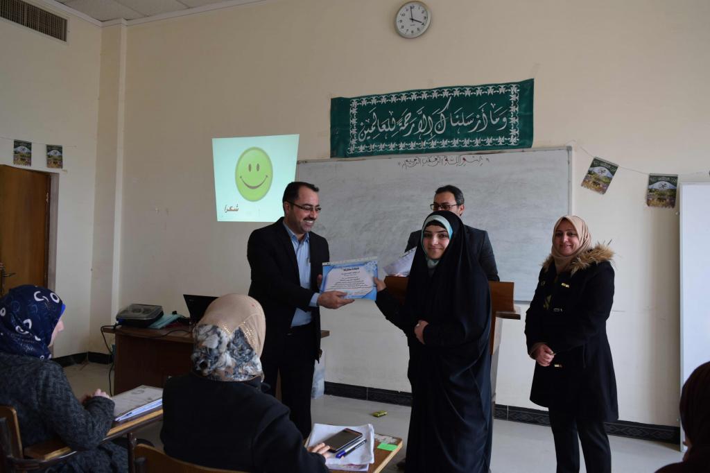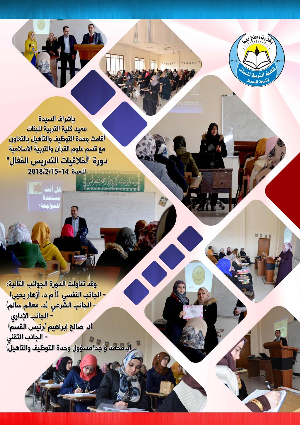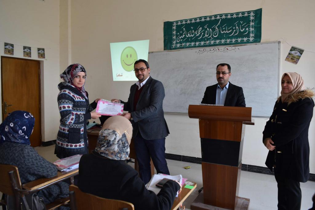تحت اشراف السيدة عميد كلية التربية للبنات اختتمت يوم الخميس الموافق 15 شباط 2018 دورة "اخلاقيات التدريس الفعّال" التي اقامتها وحدة التوظيف والتأهيل وبالتعاون مع قسم علوم القرآن والتربية الاسلامية وبمشاركة 49 طالبة من اقسام الكلية، وقد أظهرت الطالبات المشاركات تفاعلاً كبيراً مع المحاضرات التي ألقيت في الدورة من خلال المداخلات والتعليقات، ثم قام كلّاً من د. أزهار يحيى قاسم ود. صالح ابراهيم صالح ود. محمد واجد محمدعلي بتوزيع شهادات المشاركة على الطالبات متمنين لهنّ الموفقية في مشوارهنّ العلمي والعملي خدمة لبلدنا الحبيب.