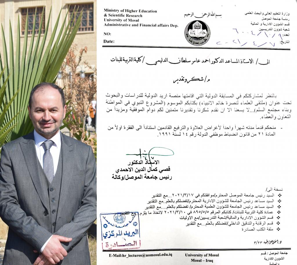 تثميناً لجهودهم المبذولة وتكريماً لمواقفهم الطيبة، السيد رئيس جامعة الموصل يمنح كتب شكر لكل من اساتذة كلية التربية البنات التالية اسمائهم:- الاستاذ المساعد الدكتورة فرحة خلف عمر.- الاستاذ المساعد الدكتور صالح إبراهيم صالح.- الدكتور فؤاد سالم اسماعيل.وذلك لاشغالهم منصب رئيس قسم اثناء فترة النزوج وما بعدها.- الاستاذ المساعد الدكتورة ابتهاج زكي سليمان- الاستاذ المساعد الدكتور محمد واجد- الدكتور احمد مظفر محمد- الدكتورة هند أحمد محمودوذلك لكونهم اعضاء اللجنة التحضيرية لمؤتمر النانو تكنلوجي الافتراضي.- الاستاذ المساعد الدكتور أحمد عامر سلطانوذلك لفوزه بالمرتبة الأولى في مسابقة منصة “اريد” الدولية.كل التوفيق للاساتذة المجتهدين وهم يرفعون اسم الكلية بين كليات جامعة الموصل.