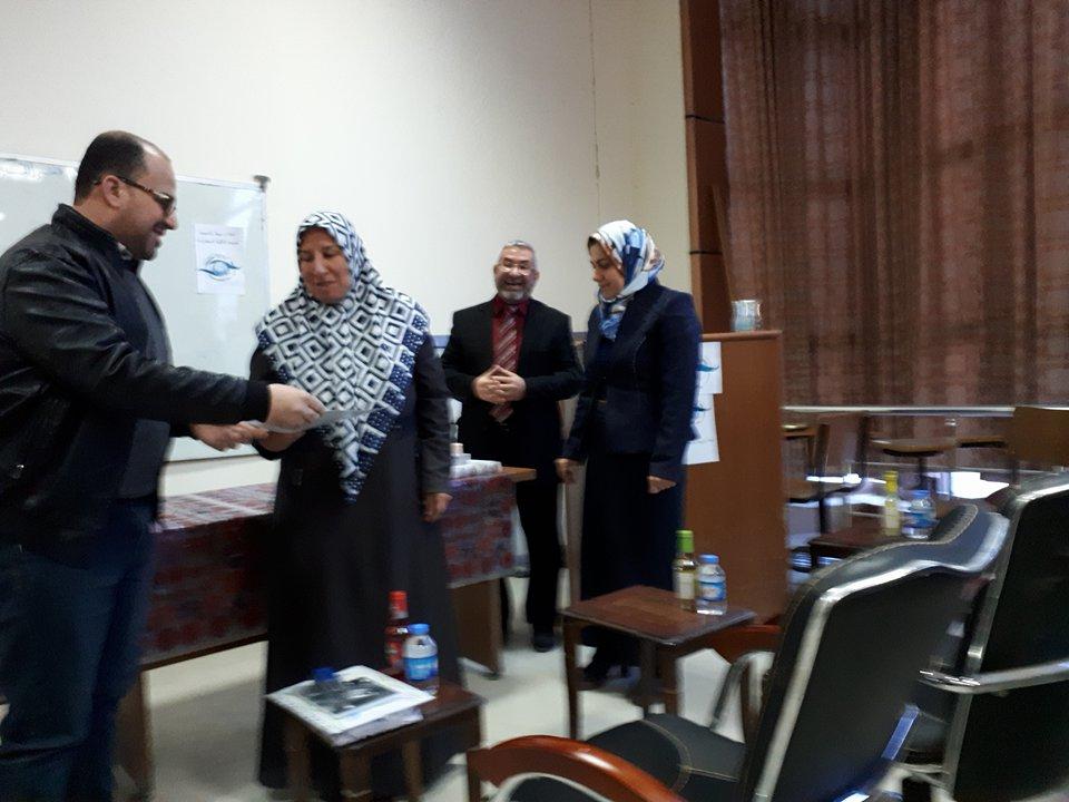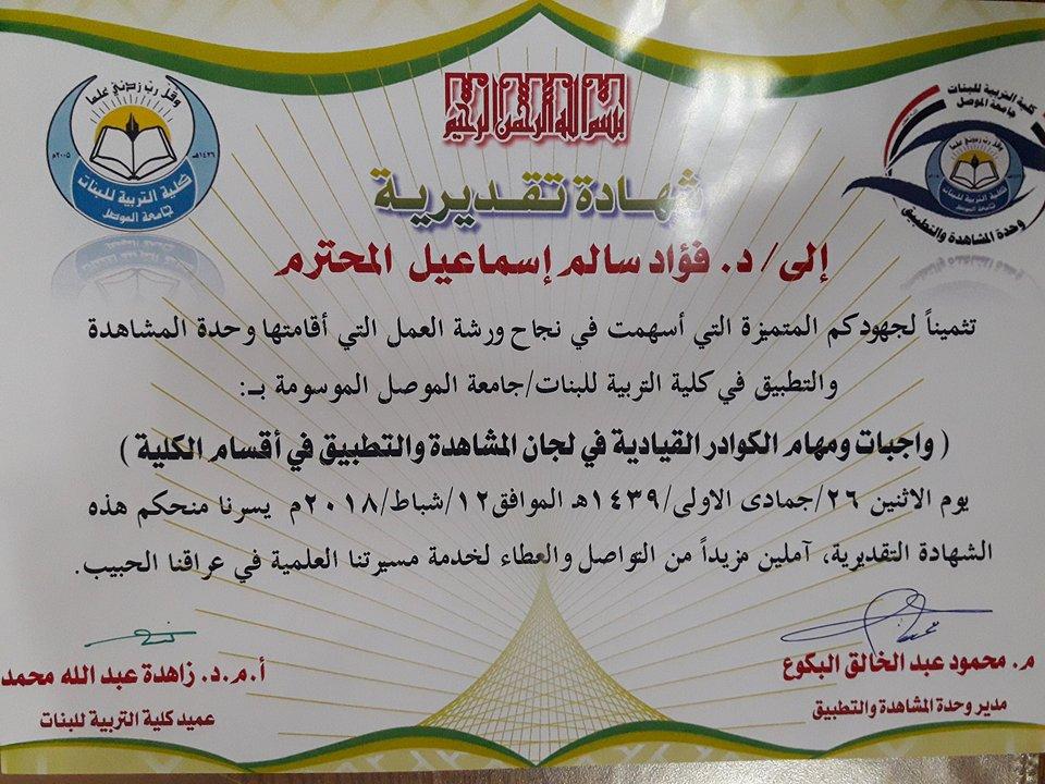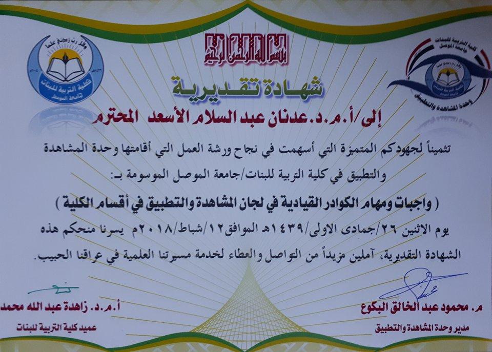مهام الكوادر القيادية في لجان التطبيقورشة عمل لوحدة المشاهدة والتطبيقبرعاية السيدة عميد كلية التربية للبنات وبحضور وفد من مديرية تربية نينوى، أقامت وحدة المشاهدة والتطبيق في الكلية ورشة عمل بعنوان "واجبات و مهام الكوادر القيادية في لجان المشاهدة والتطبيق في اقسام الكلية" وقد استهلت الندوة بكلمة ترحيبية ألقاها السيد محمود عبد الخالق البكوع مدير الوحدة ومؤكداً على سعي الوحدة الحثيث لخدمة الحركة العلمية في جامعتنا الغراء، بعد ذلك أنصت الحاضرون الى آيات من الذكر الحكيم تلاها الدكتور ادريس سليمان مصطفى لتتحدث بعدها السيدة عميد الكلية عن اهمية هذه الورشة في رفع المستوى العلمي لدى طالبات الكلية مؤكدة على ضرورة مواصلة العمل الدؤوب في جميع الاصعدة العلمية.ثم بدأت الورشة بمحاضرة واسعة لمديرها عن كيفية متابعة طالبات التطبيق وفق الاسس العلمية الرصينة والواجبات الملقاة على لجان التطبيق في الكلية. وفي ختام الورشة منح السيد مدير وحدة المشاهدة والتطبيق هدية تذكارية للسيدة عميد الكلية لجهودها في دعم انشطة الوحدة كما وزعت السيدة عميد الكلية الشهادات والهدايا التقديرية على الحضور والمساهمين في الورشة.