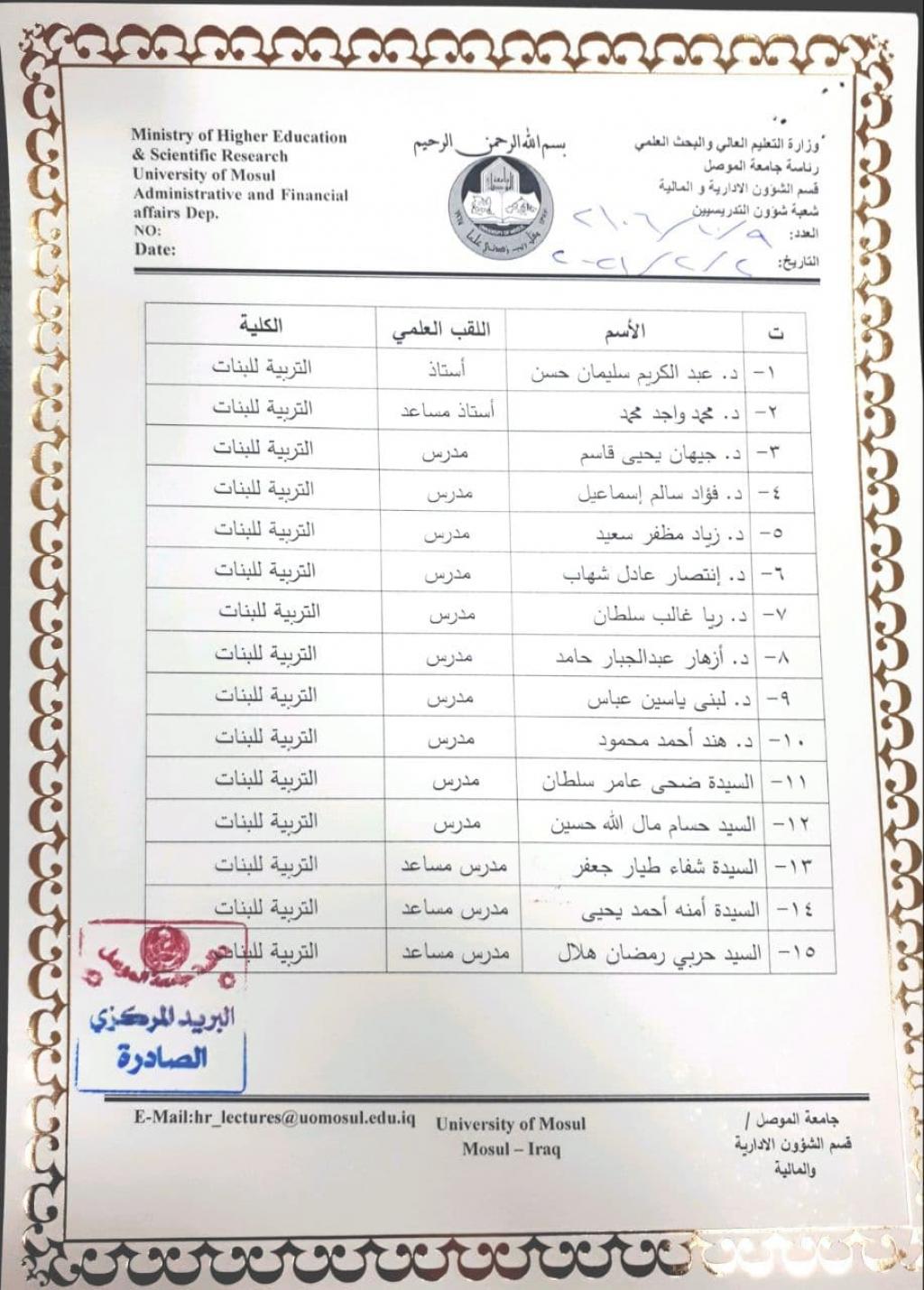 بالنظر للنتاجات العلمية المتميزة لاساتذة كلية التربية للبنات، السيد رئيس جامعة الموصل يقدم الشكر والتقدير لـ(15) تدريسي، وذلك لنشر ابحاثهم في مجلات علمية رصينة ومنضوية تحت مستوعبات سكوبص، كل التوفيق لاساتذة الكلية ومساهمتهم في رفع مستوى الكلية العلمي والاكاديمي.
