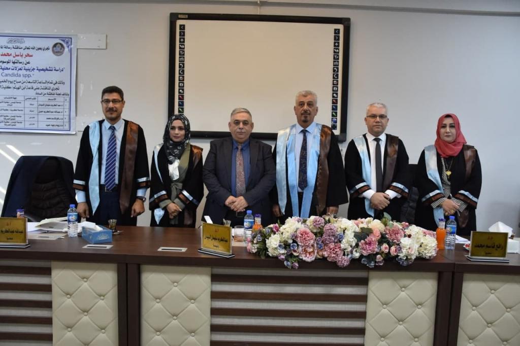شارك الاستاذ الدكتور عبدالكريم سليمان السيدان بوصفه رئيساً في لجنة مناقشة رسالة الماجستير الموسومة (دراسة تشخيصية جزيئية لعزلات محلية مختلفة من الخميرة الـ Candida spp) ، يوم الخميس 11 تشرين الثاني 2021 ، حضر جانباً منها السيد مساعد رئيس الجامعة للشؤون العلمية الاستاذ الدكتور منير سالم طه وعدد من السادة التدريسيين في الكلية .تضمنت الدراسة التي تقدمت بها الطالبة سحر باسل محمد علي ، عزل وتشخيص خمائر Candida spp. من المرضى المصابين بداء المبيضات في بعض مستشفيات مدينة الموصل(مستشفى السلام ، مستشفى الخنساء ، مستشفى ابن الاثير) .تطرقت الرسالة الى دراسة عوامل الضراوة لهذه العزلات ومنها تكوين الاغشية الحيوية Biofilm، والتي تعد احدى عوامل الضراوة المهمة التي تتميز بها خميرة الـ Candida، اذ أظهرت العزلات القدرة على انتاج الغشاء الحيوي Biofilm بنسبة 50%، وكذلك تمكنت هذه العزلات من انتاج انزيم الفوسفولايبيز Phospholipase بنسبة 40%. كما أُجري التشخيص الجزيئي للعزلات قيد الدراسة بإستخدام مؤشرات التفاعل التضاعفي المتسلسل Specific-PCR وبواسطة بادئات متخصصة (ITS1،ITS4).اظهرت نتائج الدراسة عشرة حزم من الـ DNA الجينومي المنقى من العزلات قيد الدراسة بحجم واحد ((700bp)، كما جرى خلالها تسجيل عزلتين جديدتين من خميرة الـ Candida في البنك العالمي للجينات.ترأس لجنة المناقشة الاستاذ الدكتورعبدالكريم سليمان السيدان وعضوية كلاً من الاستاذ الدكتور عبدالله عبدالكريم حسن والمدرس الدكتور رافع قاسم محمد وبإشراف وعضوية المدرس الدكتورة زينة وجيه حميد