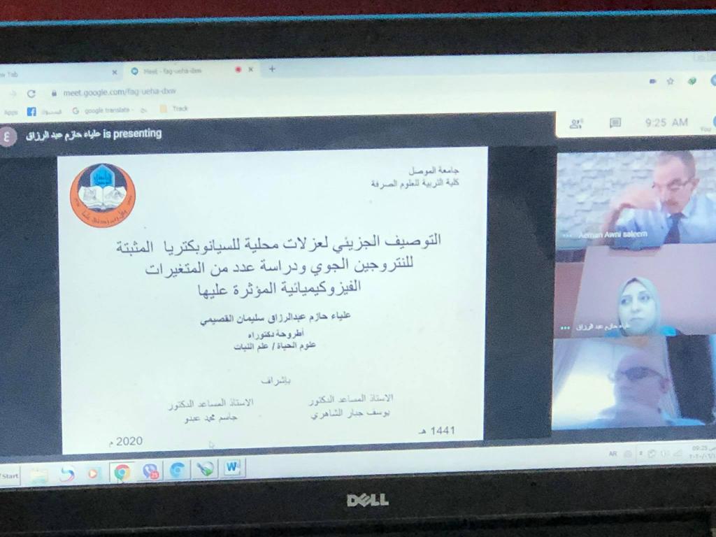حصلت التدريسية علياء حازم القصيمي احدى اعضاء هيئة التدريس في قسم علوم الحياة / كلية التربية للبنات على درجة الدكتوراه بعد مناقشة رسالتها الموسومة بـ(التوصيف الجزيئي وتاثير عددمن المتغيرات الفيزوكيميائيه على السيانوبكتريا المثبته للنتروجين الجوي الناميه في بعض الانظمه البيئيه في شمال العراق) والتي جرت يوم الخميس الموافق 18 حزيران 2020، في قسم علوم الحياة / كلية التربية للعلوم الصرفة وبحضور الاستاذ الدكتور منير سالم طه مساعد رئيس الجامعة للشؤون العلمية، مبارك لقسم علوم الحياة ولكلية التربية للبنات الدرجة العلمية الجديدة.