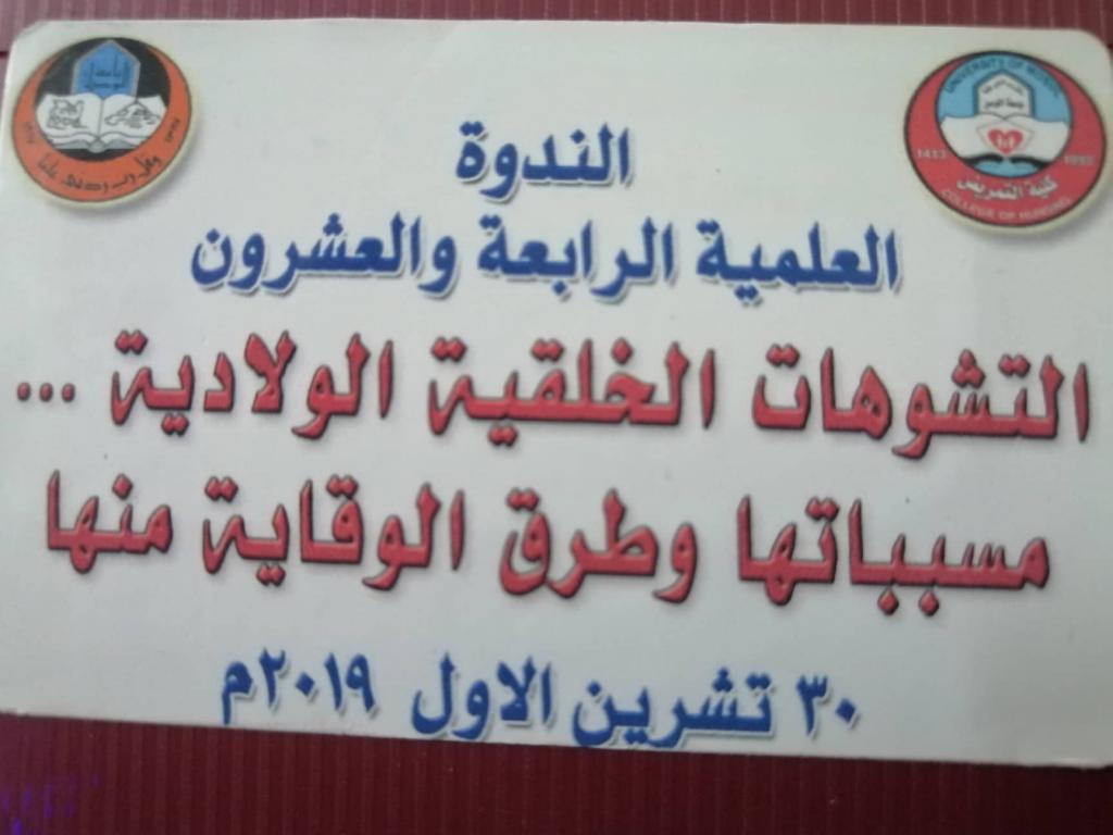 شاركت د.لقاء حسين علي التدريسية في قسم علوم الحياة في الندوة العلمية الرابعة والعشرين التي اقامتها كلية التمريض تحت عنوان ( التشوهات الخلقية الولادية مسبباتها وطرق الوقاية منها) حيث كانت مشاركتها ببحثها الموسوم (التشوهات في الاطفال وداء المقوسات الخلقي) وذلك يوم الاربعاء الموافق 30/ 10/ 2019.