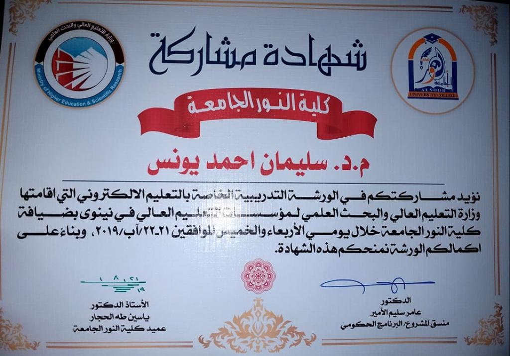 ضمن برنامج وزارة التعليم العالي والبحث العلمي لرفد المؤسسات العلمية بالخبرة المطلوبة على طريق التداول الالكتروني لمفردات التعليم شارك الدكتور سليمان احمد المولى التدريسي في قسم علوم القرآن والتريبة الاسلامية في اعمال الورشة الخاصة بموضوع التعليم الالكتروني والتي بدأت اعمالها في كلية التور الجامعة صباح يوم الاربعاء الموافق 21 آب 2019 واستمرت لمدة يومين، تضمنت الورشة القاء محاضرات علمية من اساتذة مختصين من الوزارة برئاسة الدكتور عامر سليم الامير منسق المشروع / البرنامج الحكومي.