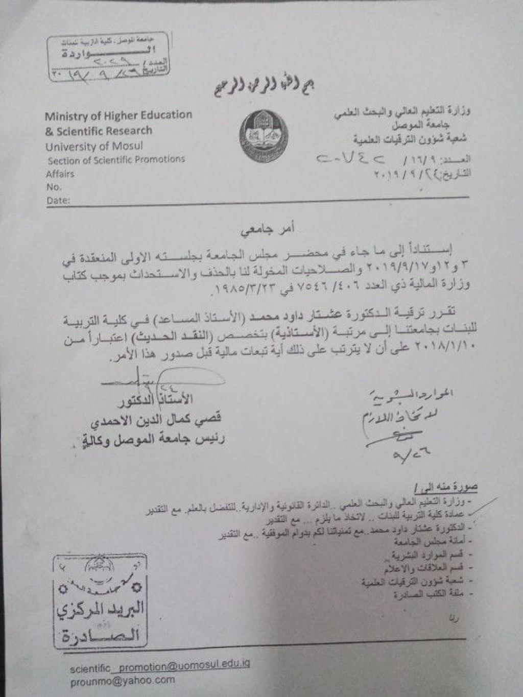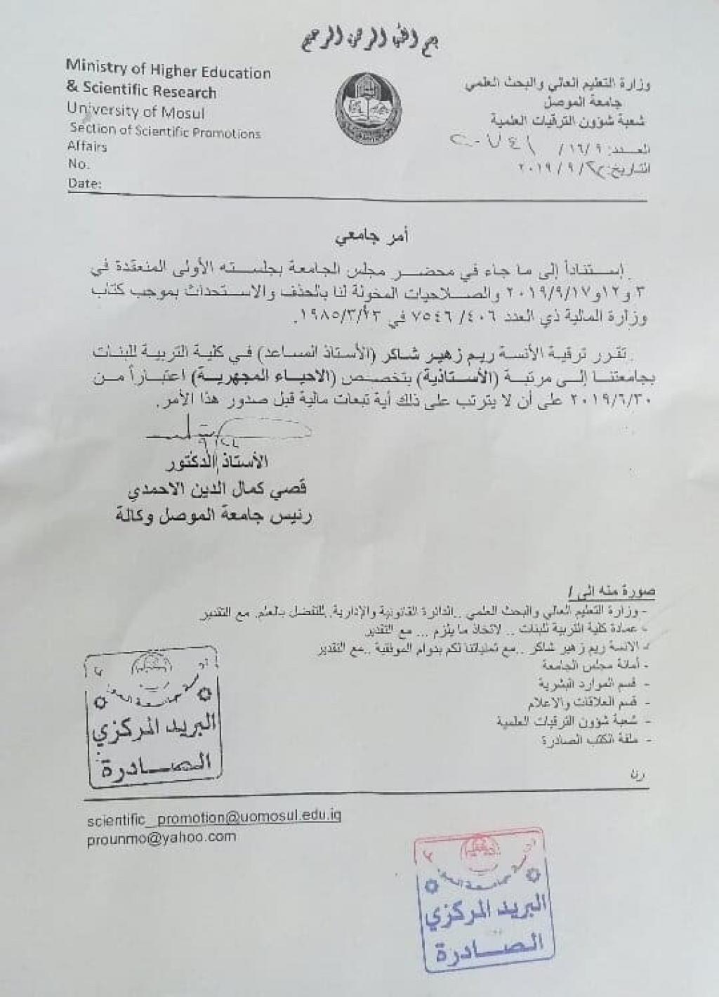 ضمن نشاطات الكلية العلمية، تم ترقية تدريسيتين في الكلية الى مرتبة (الأستاذية)، اذ ترقت أ.د. عشتار داود محمد التدريسية في قسم اللغة العربية في تخصص (النقد الحديث)، من تاريخ 10 / 1/ 2018، بينما ترقت أ. ريم زهير التدريسية في قسم علوم الحياة بتخصص “الاحياء المجهرية” ومن تاريخ 30 / 6 / 2019. متمينين لجميع كادر الكلية الاستمرار بالرُقي والتقدم العلمي.