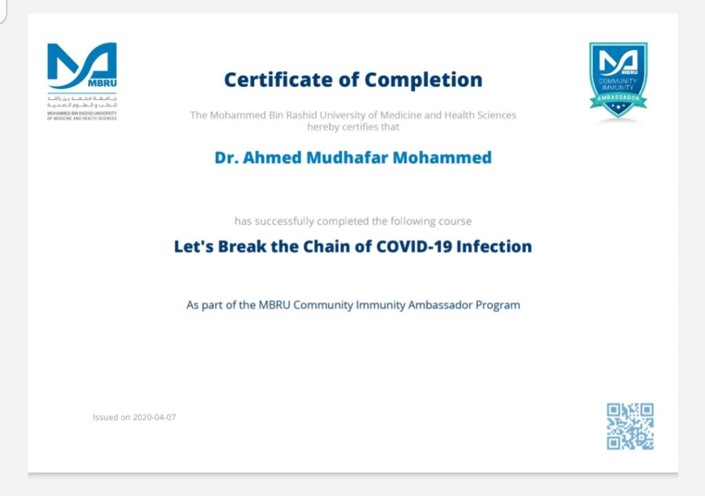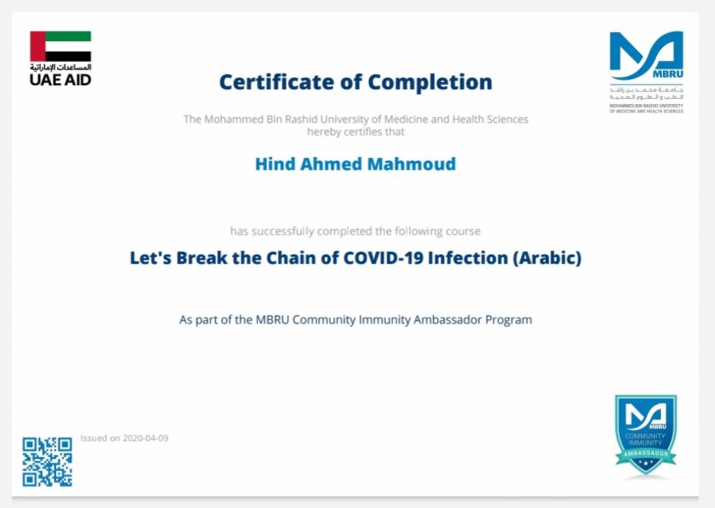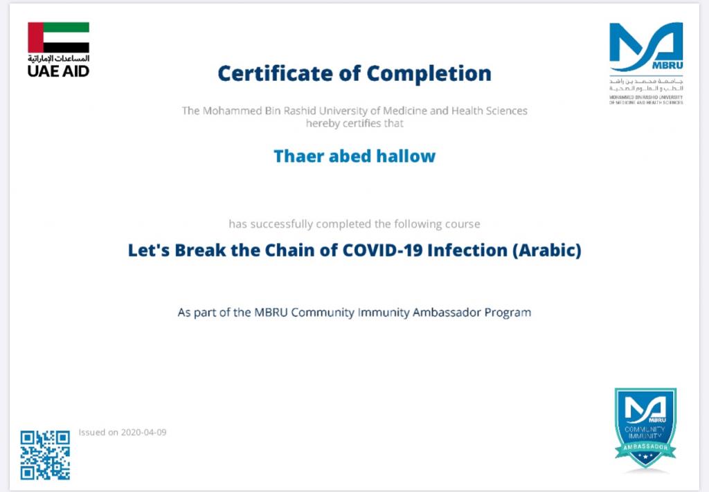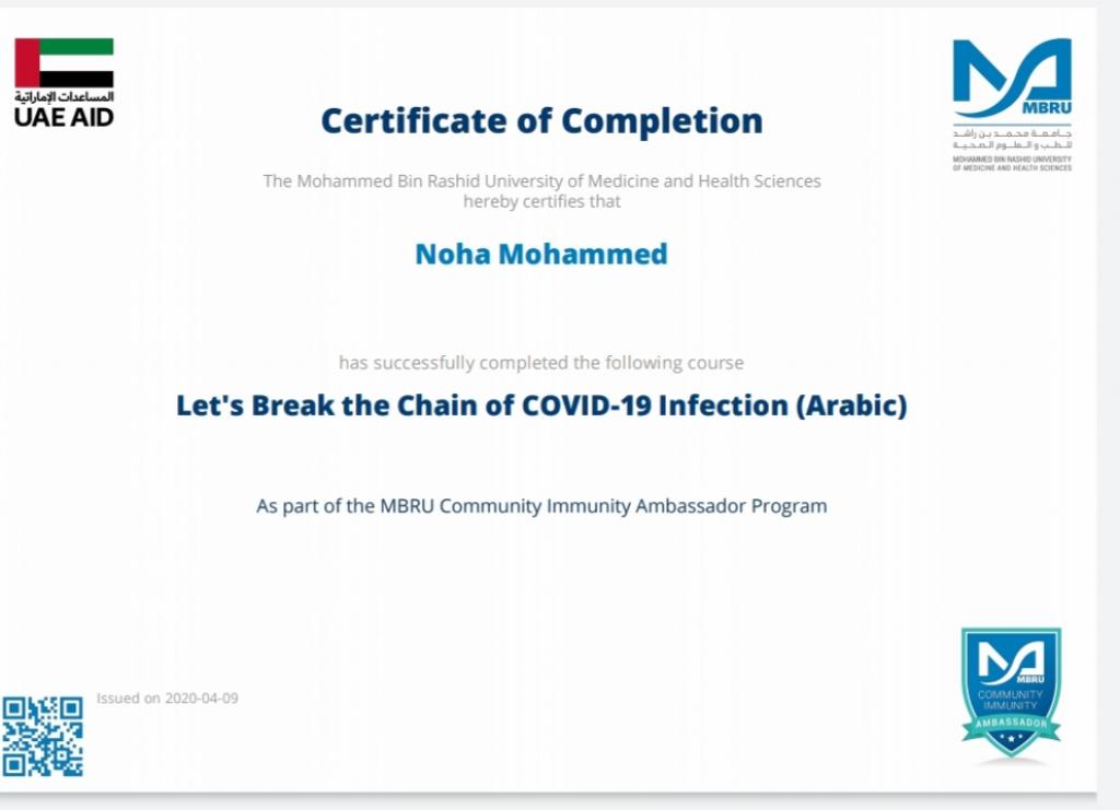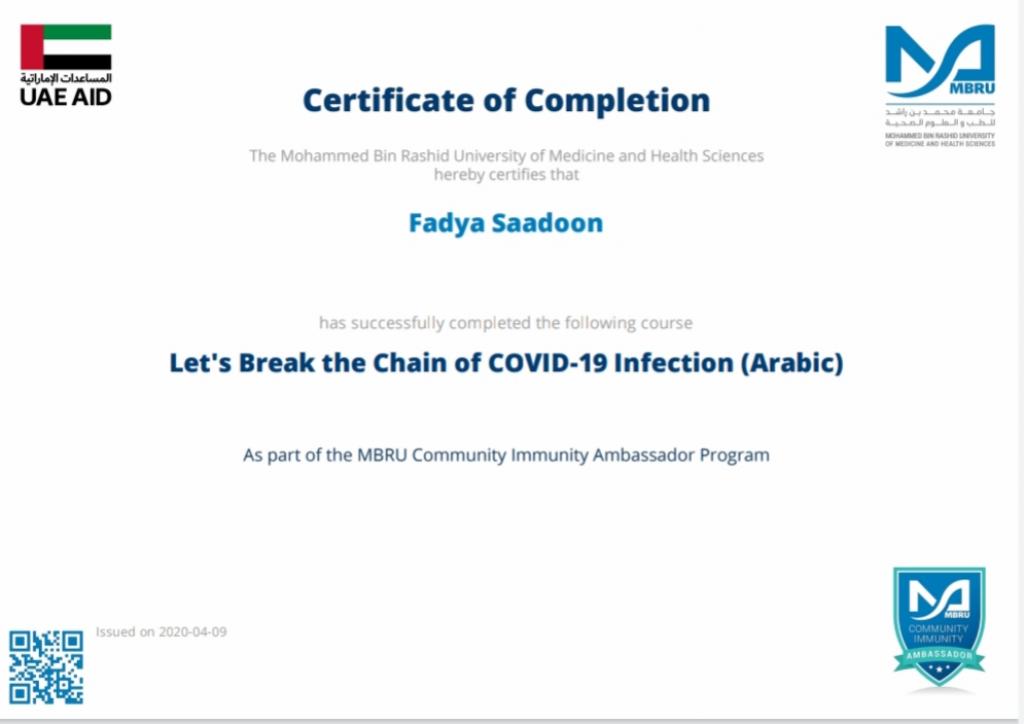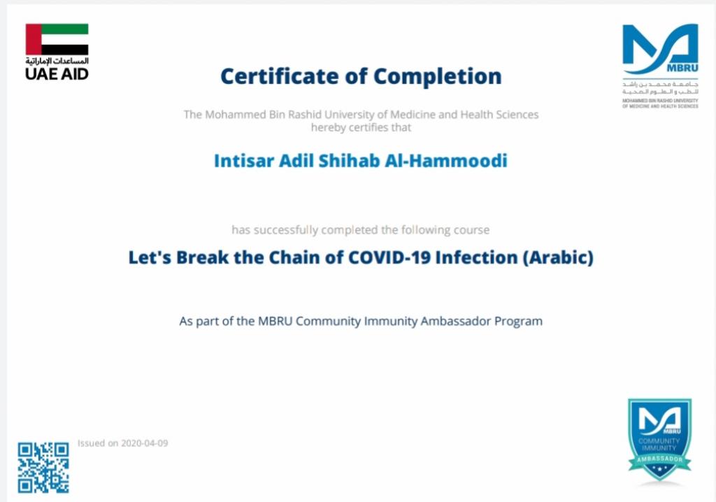 ضمن توجيهات السيد رئيس جامعة الموصل، بالاشتراك في الندوات وورش العمل والبرامج الالكترونية، شارك 19 تدريسي من تدريسيي وتدريسيات كلية التربية للبنات في برنامج كن سفيراً الذي اقامته جامعة محمد بن راشد للطب والعلوم الصحية لسفراء مناعة المجتمع، اذ اجتاز المشاركون المقرر في البرنامج والذي كان تحت عنوان “دعونا نكسر سلسلة عدوى كوفيد-19″ ، وحصلوا على شهادات مشاركة واتمام الكورس بنجاح. تمنياتنا ودعائنا لكم جميعا” بدوام الصحة وتمام العافية.