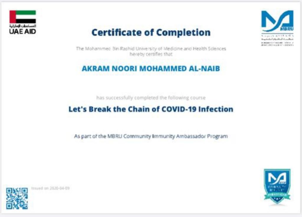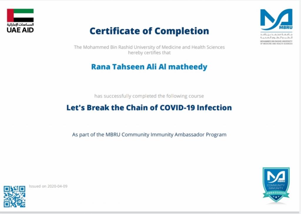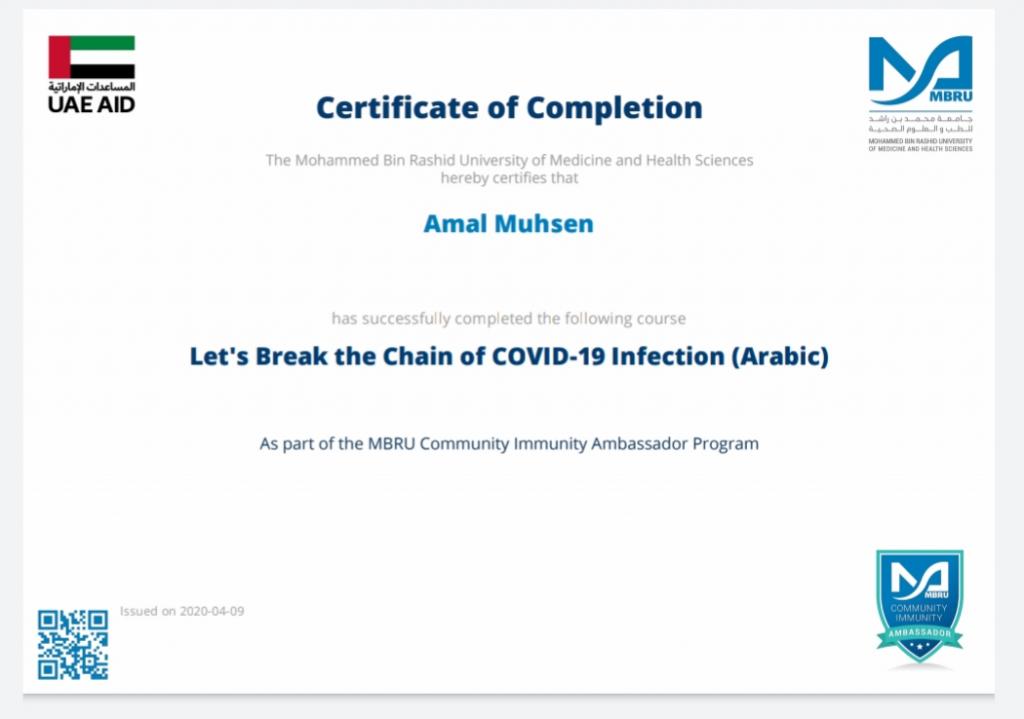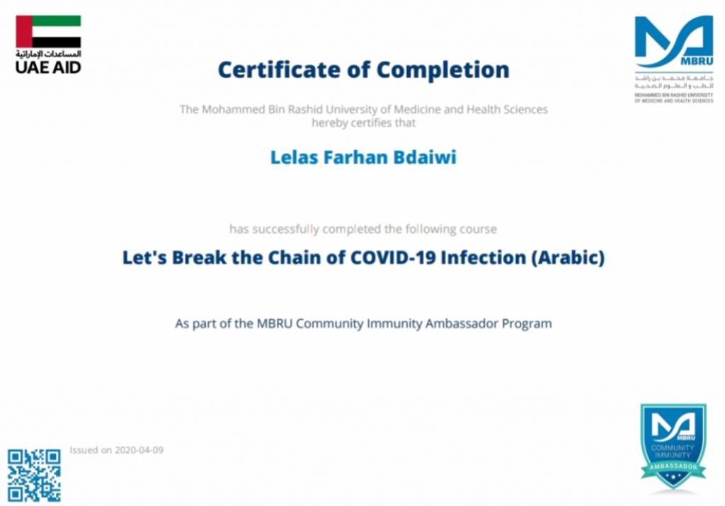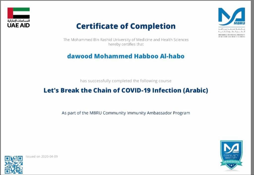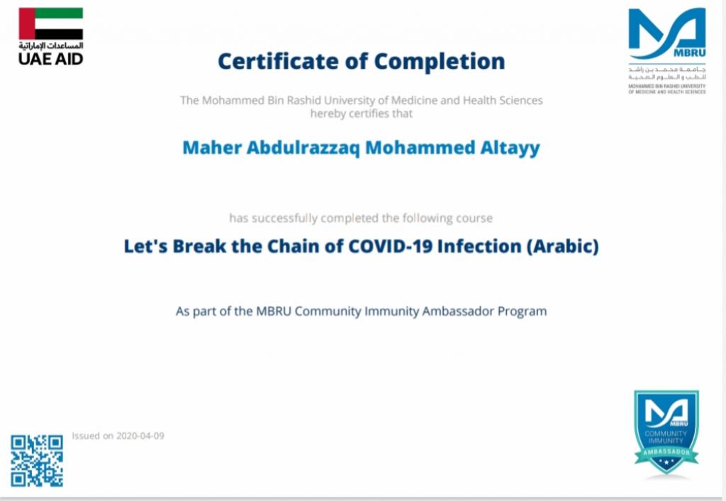 ضمن توجيهات السيد رئيس جامعة الموصل، بالاشتراك في الندوات وورش العمل والبرامج الالكترونية، شارك 19 تدريسي من تدريسيي وتدريسيات كلية التربية للبنات في برنامج كن سفيراً الذي اقامته جامعة محمد بن راشد للطب والعلوم الصحية لسفراء مناعة المجتمع، اذ اجتاز المشاركون المقرر في البرنامج والذي كان تحت عنوان “دعونا نكسر سلسلة عدوى كوفيد-19″ ، وحصلوا على شهادات مشاركة واتمام الكورس بنجاح. تمنياتنا ودعائنا لكم جميعا” بدوام الصحة وتمام العافية.
