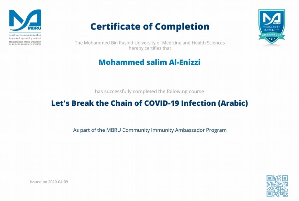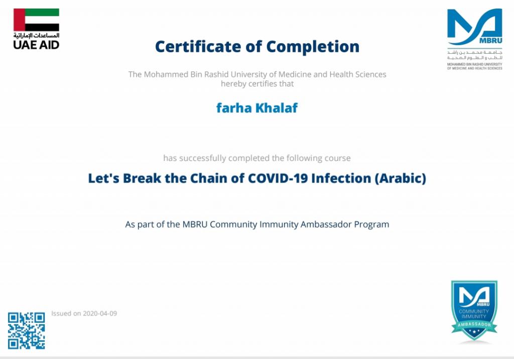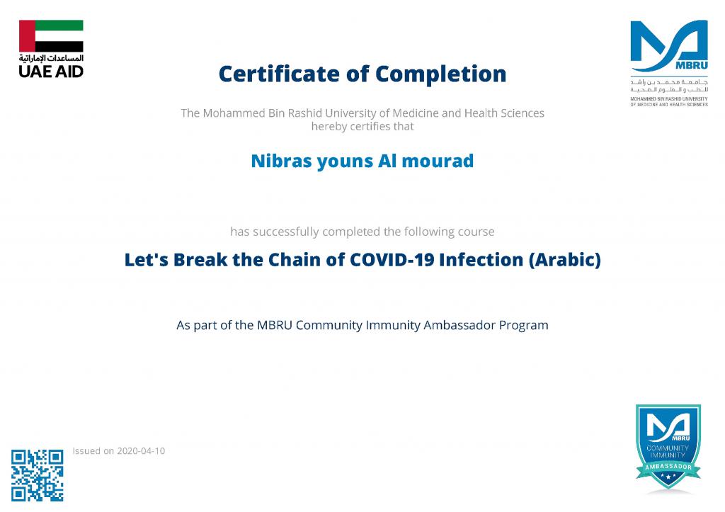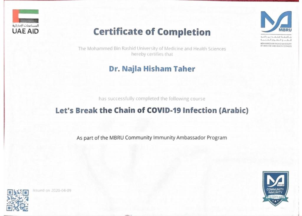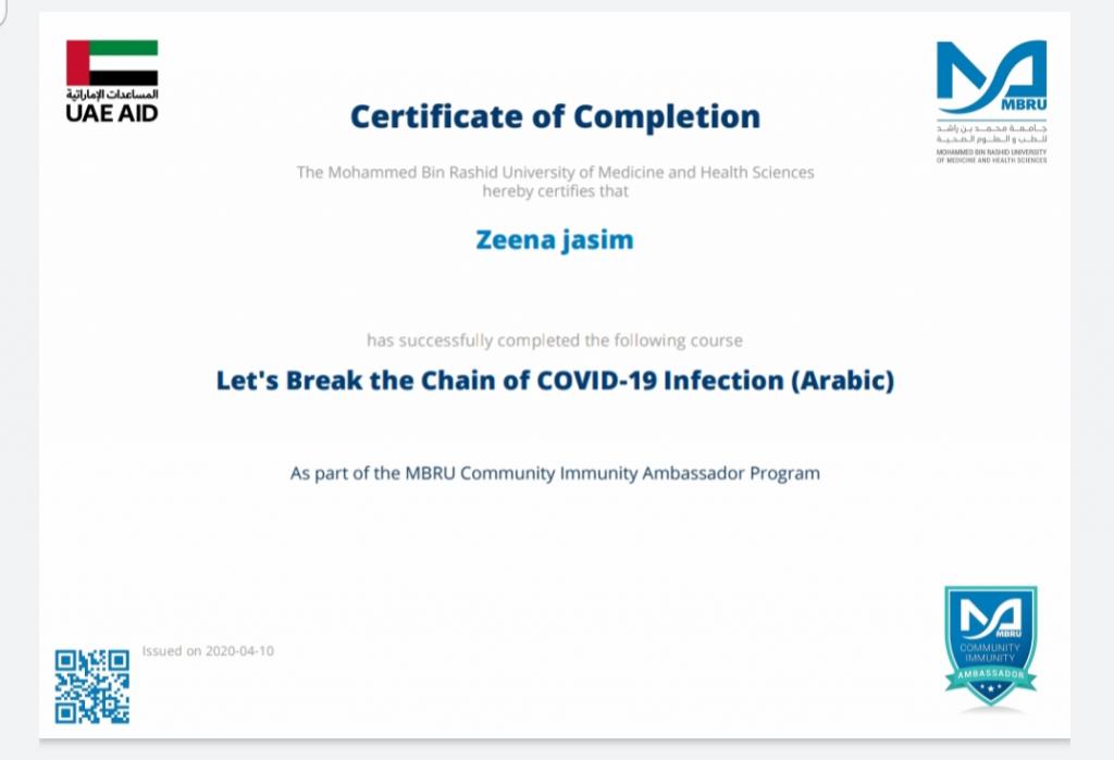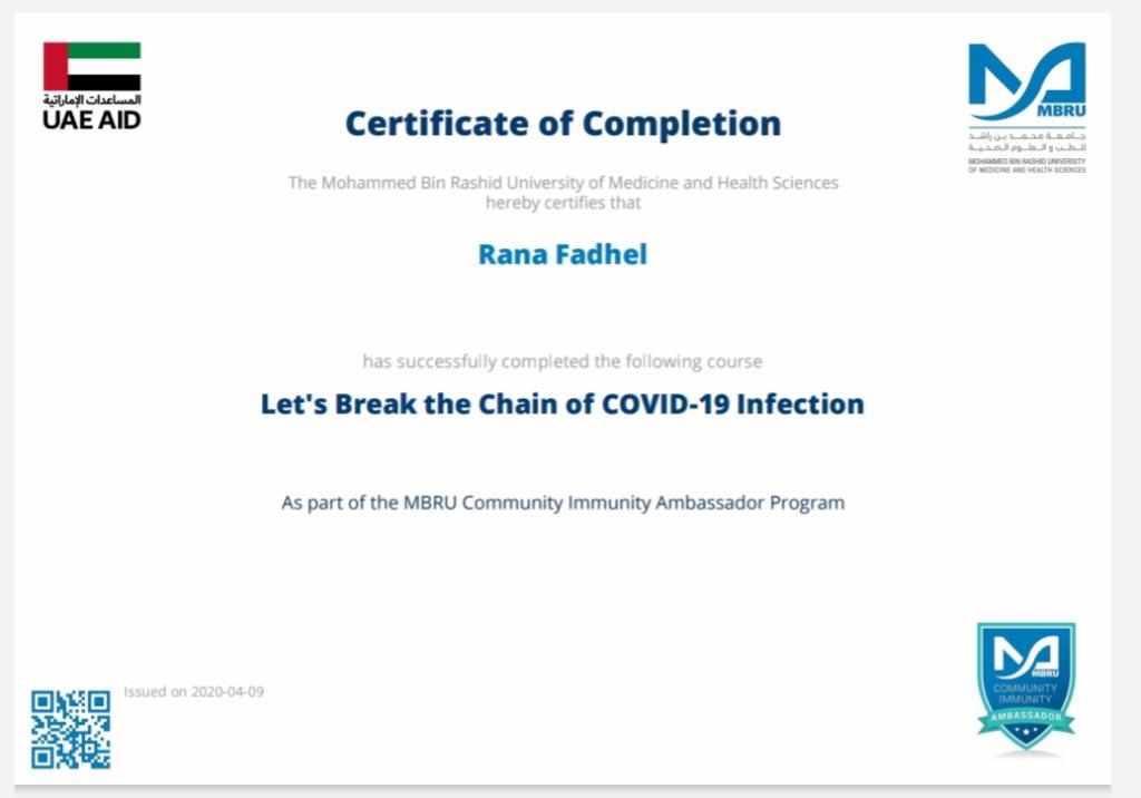 ضمن توجيهات السيد رئيس جامعة الموصل، بالاشتراك في الندوات وورش العمل والبرامج الالكترونية، شارك 19 تدريسي من تدريسيي وتدريسيات كلية التربية للبنات في برنامج كن سفيراً الذي اقامته جامعة محمد بن راشد للطب والعلوم الصحية لسفراء مناعة المجتمع، اذ اجتاز المشاركون المقرر في البرنامج والذي كان تحت عنوان “دعونا نكسر سلسلة عدوى كوفيد-19″ ، وحصلوا على شهادات مشاركة واتمام الكورس بنجاح. تمنياتنا ودعائنا لكم جميعا” بدوام الصحة وتمام العافية.