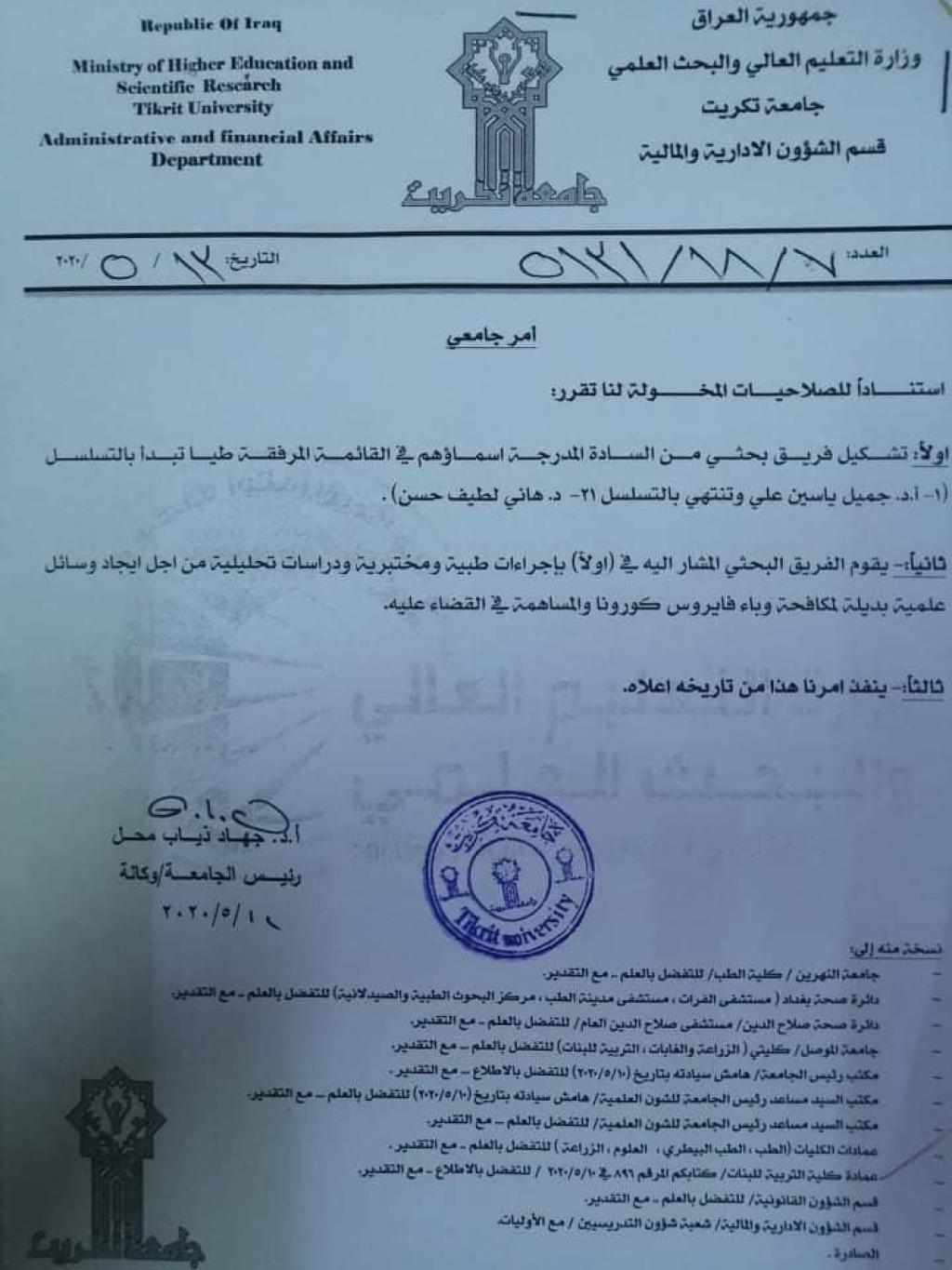 نظراً للسمعة العلمية التي يتمتع بها اساتذة كلية التربية للبنات، تم تكليف الاستاذ الدكتور أياد جاجان خورشيد التدريسي في قسم علوم الحياة كاستشاري للفريق البحثي المشكل من قبل رئاسة جامعة تكريت، وذلك لايجاد وسال علمية بديلة لمكافحة فايروس كورونا والمساهمة في القضاء عليه، جاء ذلك في الامر الجامعي المؤرخ 13 آيار 2020 والصادر من رئاسة جامعة تكريت.