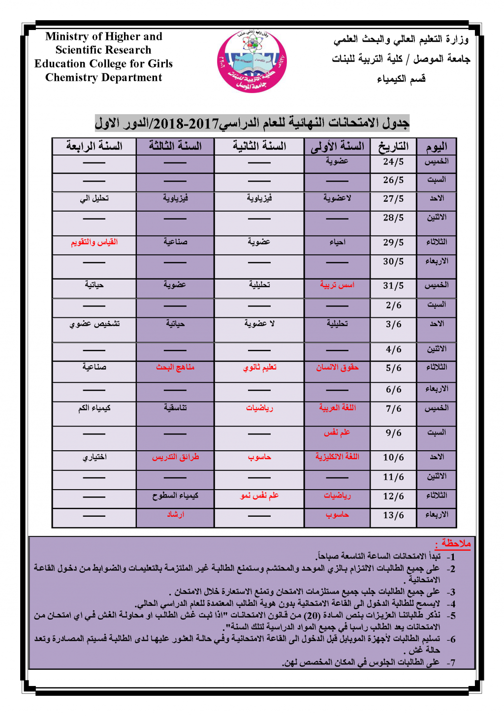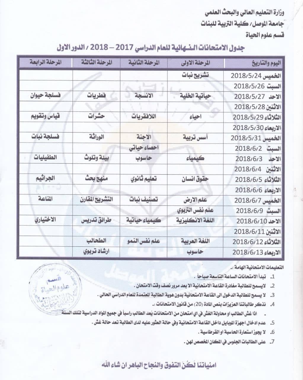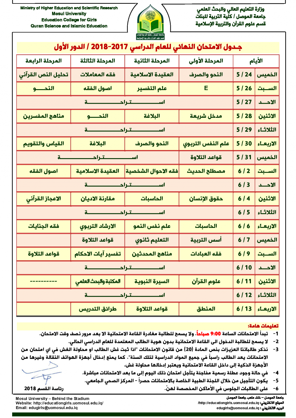 جداول الامتحانات النهائية للعام الدراسي 2017 / 2018 الدور الاولنرجو من طالباتات العزيزات الالتزام بالتعليمات الهامة التالية:1- تبدأ الامتحانات الساعة 9:00 صباحاً. ولا يسمح للطالبة مغادرة القاعة الامتحانية الا بعد مرور نصف وقت الامتحان.2- لا يسمح للطالبة الدخول الى القاعة الامتحانية بدون هوية الطالب المعتمدة للعام الدراسي الحالي.3- نذكر طالباتنا العزيزات بنص المادة (20) من قانون الامتحانات "اذا ثبت غش الطالب او محاولة الغش في اي امتحان من الامتحانات يعد الطالب راسباً في جميع المواد الدراسية لتلك السنة". كما يمنع إدخال أجهزة الهواتف النقالة وغيرها من الأجهزة الذكية إلى داخل القاعة الامتحانية ويعتبر إدخالها محاولة غش.4- في حالة وجود عطلة رسمية مفاجئة يتأجل امتحان ذلك اليوم إلى ما بعد الامتحانات مباشرة.5- يكون التأجيل من خلال اللجنة الطبية الخاصة بالامتحانات حصراً – المركز الصحي الجامعي. 6- على الطالبات الجلوس في الأماكن المخصصة لهنّ.نوصيكم طالباتنا العزيزات بالالتفات الى دروسكنّ، والتركيز على امتحاناتكنّ، وفقكنّ ربي لكل خير، ويسر لكنّ اداء الاختبارات، ورفع درجاتكنّ في عليين.قسم علوم القرآن التربية الإسلامية