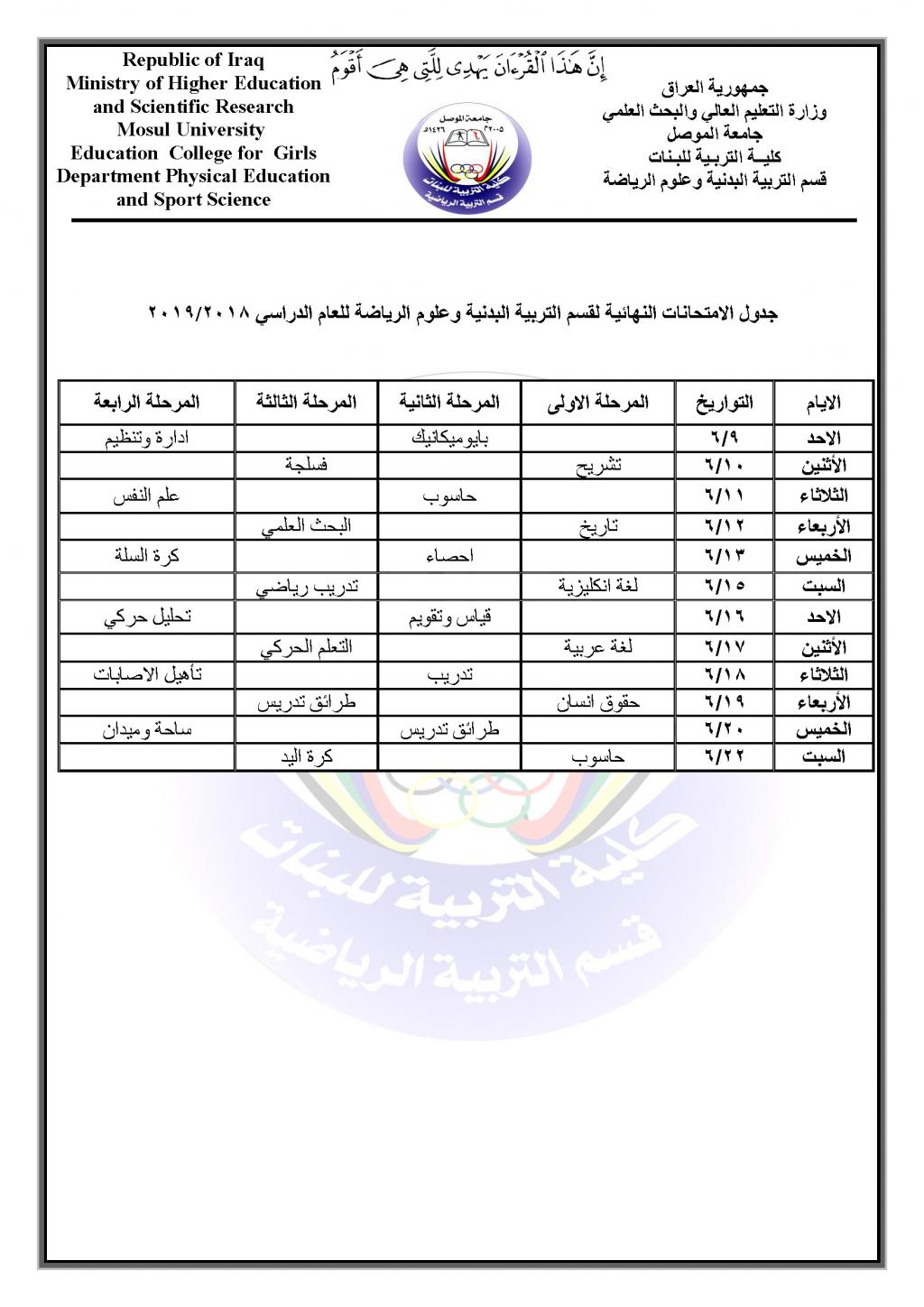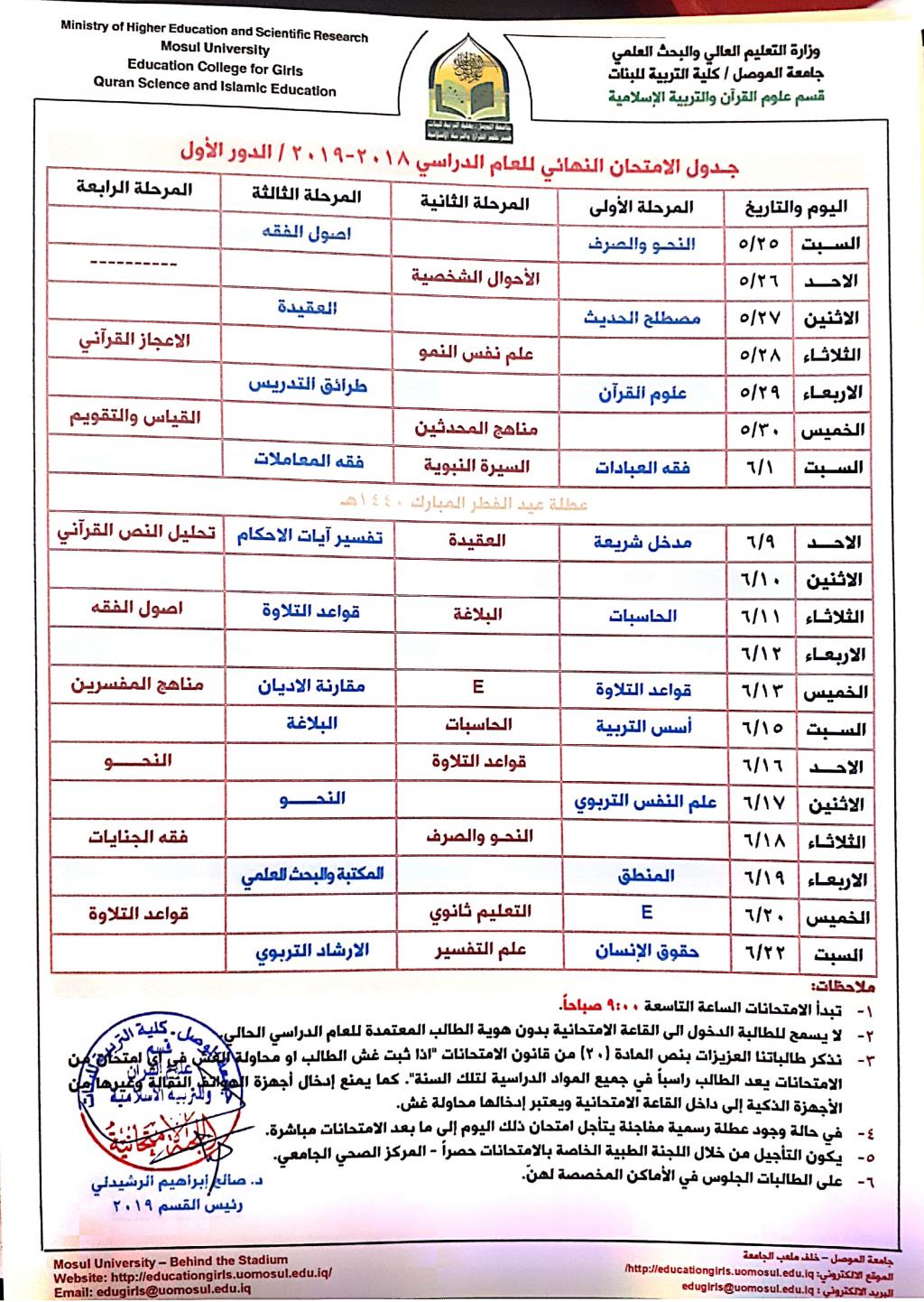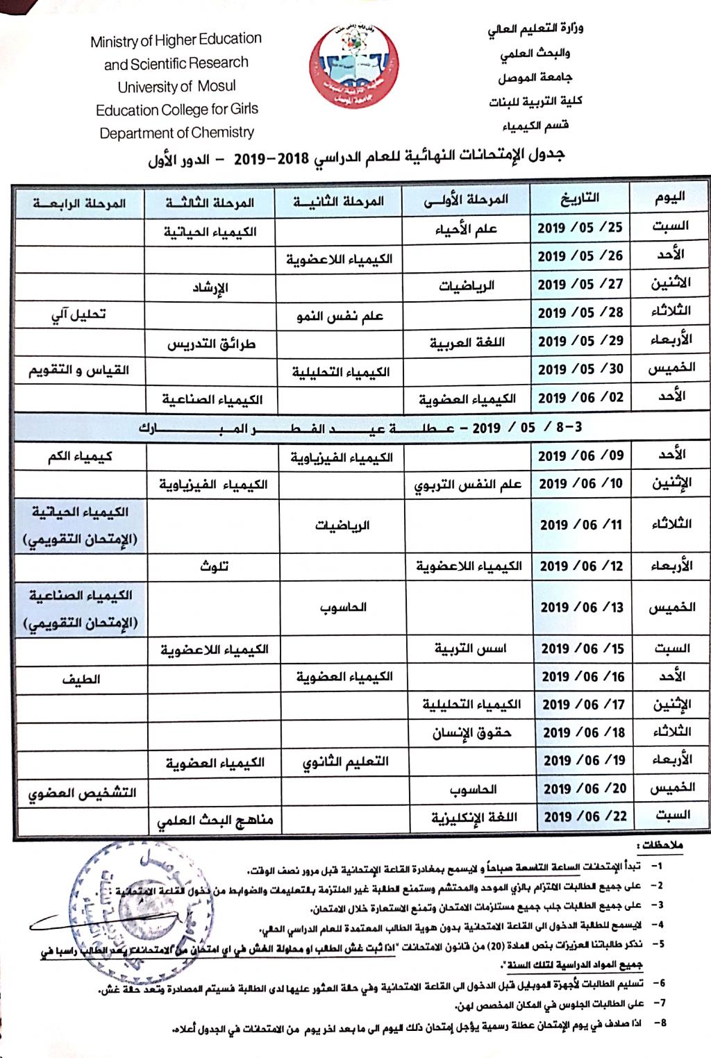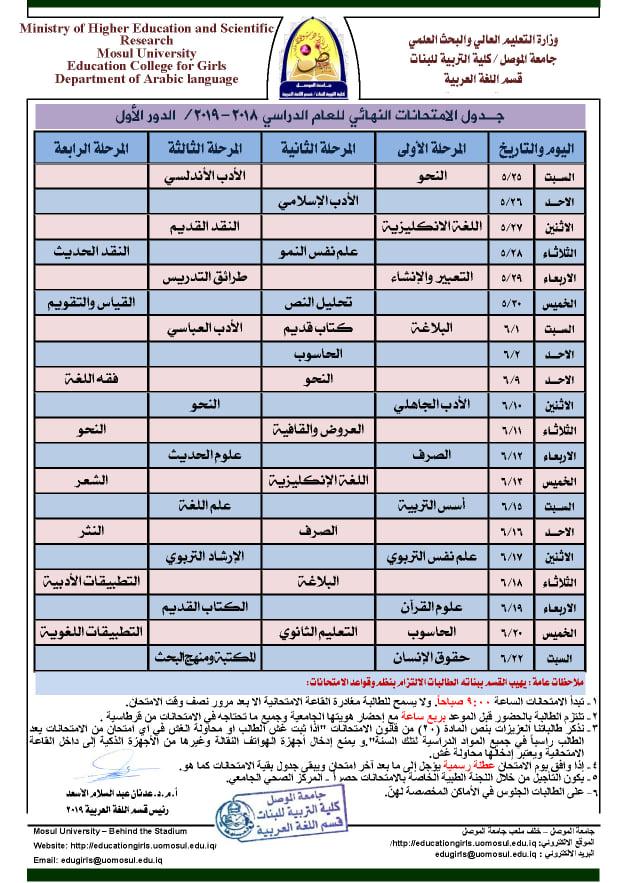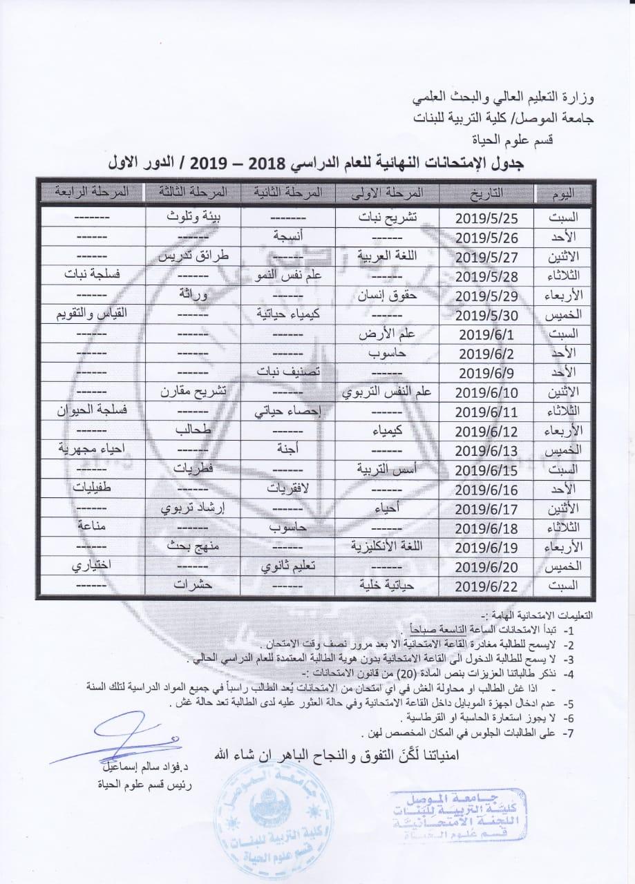 أدناهجدول الامتحان النهائي للدور الاول للعام الدراسي 2018-2019نصائح وارشادات عمادة الكلية الى الطالبات حول اداء امتحانات نهاية السنة:1- جلب هوية الجامعة او هوية الاحوال المدنية في حالة عدم توفر هوية الجامعة.