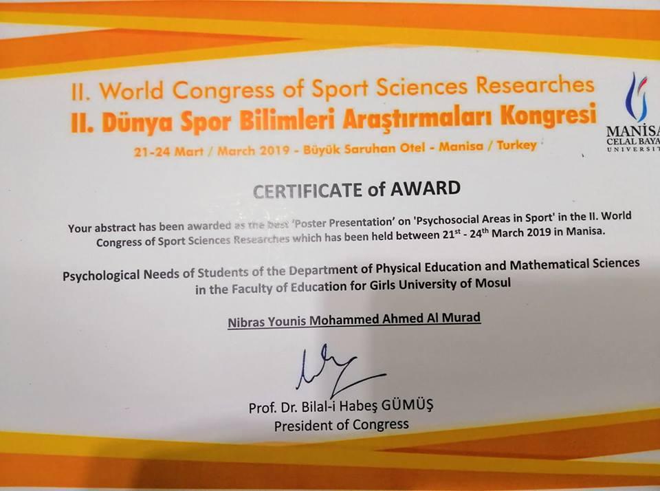 حصل الاستاذ الدكتور نبراس يونس آل مراد التدريسي في قسم علوم الرياضة والتربية البدينة، على جائزة أفضل بحث علمي في الموتمر الدولي الثاني للعلوم الرياضية‘World Congress of Sport Sciences Researches’ والذي أقيم في مدينةازمير في تركيا للمدة من 21 – 24 آّذار 2019.