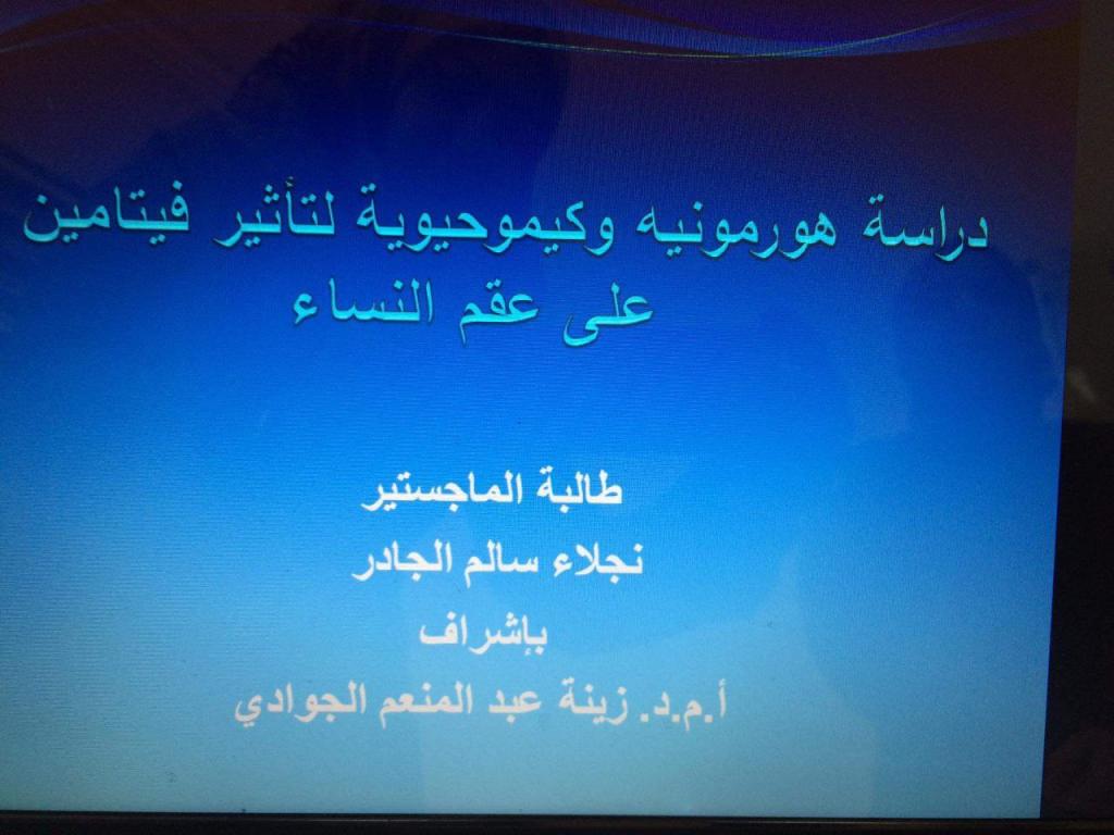 ضمن برنامج النشاطات العلمية لقسم الكيمياء للعام الدراسي ٢٠٢٠-٢٠٢١، وبحضور السيدة رئيس قسم الكيمياء أ.م.د. ابتهاج زكي سليمان آل حليم وعدد من تدريسي وتدريسات القسم .قدمت طالبة الماجستير (نجلاء سالم محمد علي الجادر) هذا اليوم الثلاثاء ٢ شباط ٢٠٢١ حلقتها الدراسية بعنوان (دراسة هرمونية وكيمو حيوية لتاثير فيتامين D على عقم النساء) وباشراف أ.م.د زينة عبد المنعم الجوادي.