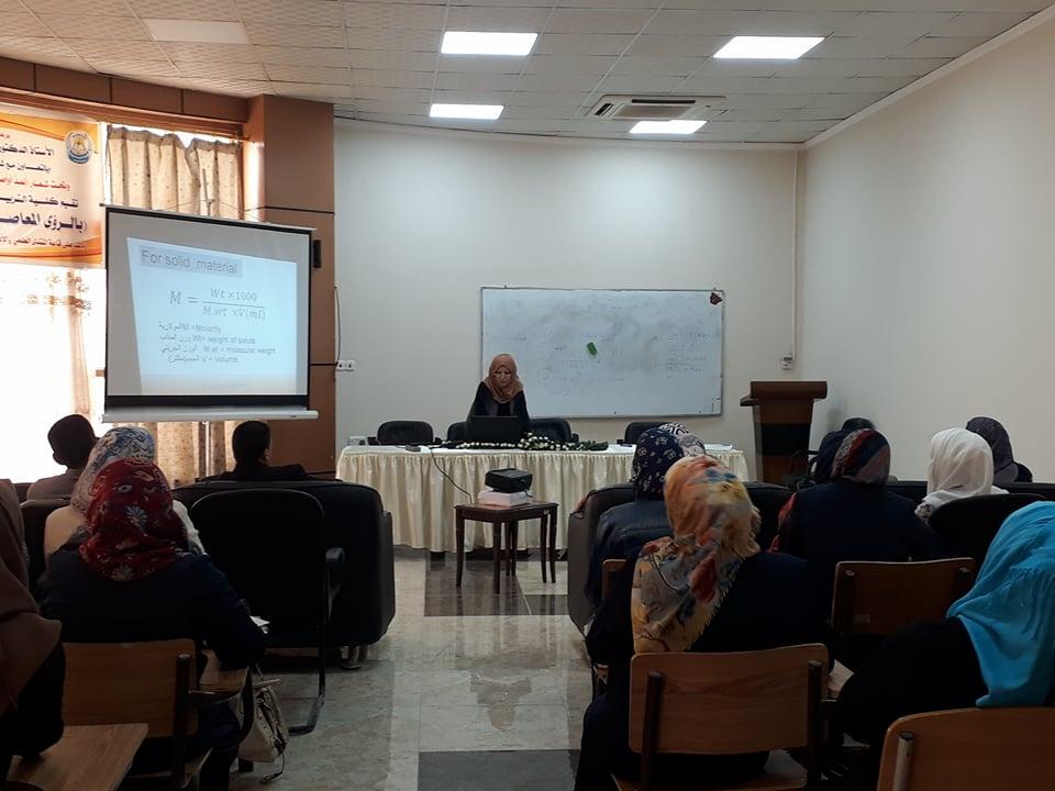 افتتحت السيدة عميد كلية التربية للبنات الاستاذ المساعد الدكتورة زاهدة عبد الله محمد، برفقة السيدة معاون العميد للشؤون الادارية الاستاذ المساعد الدكتورة شذى حازم كوركيس دورة تحضير المحاليل الكيميائية، التي يقيمها قسم الكيمياء في كليتناللمدة من 22 – 24 نيسان 2018 ، وبادارة رئيس قسم الكيمياء الاستاذ المساعد الدكتورة فرحة خلف عمر ومقررية الدورة الدكتور محمد سالم، وتستهدف عدة جهات من داخل الجامعة وخارجه، فكان اليوم الاول من الدورة يتضمن ثلاث محاضرات:المحاضرة الأولى د.فرحة عنوان المحاضرة طرق التعبير عن تراكيز المحاليل.والمحاضرة الثانية د.رنا تحسين التوصيلية الكهربائية للمحاليل والعوامل المؤثرة.اما المحاضرة الثالثة د.محمد سالم التحليل الحجمي والمحاليل القياسية.