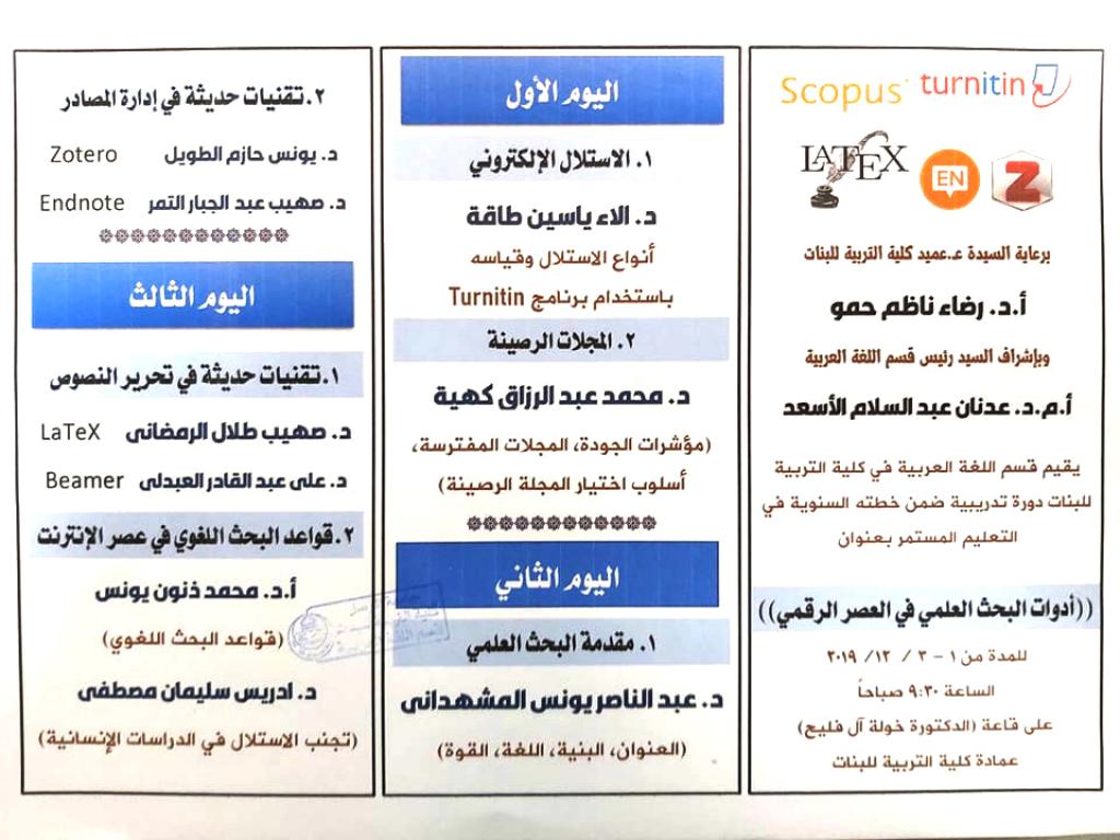 ضمن المنهاج السنوي للتعليم المستمر وبرعاية السيدة وكيل عميد كلية التربية للبنات أ.م.د. رضاء ناظم حمو معاون العميد للشؤون العلمية، وبإدارة أ.م.د. عدنان عبدالسلام رئيس قسم اللغة العربية، ستقام دورة تدريبية عن (أدوات البحث العلمي في العصر الرقمي) في قسم اللغة العربية للمدة من 1 – 3 كانون الاول 2019 وحسب البرنامج المرفق ادناه: