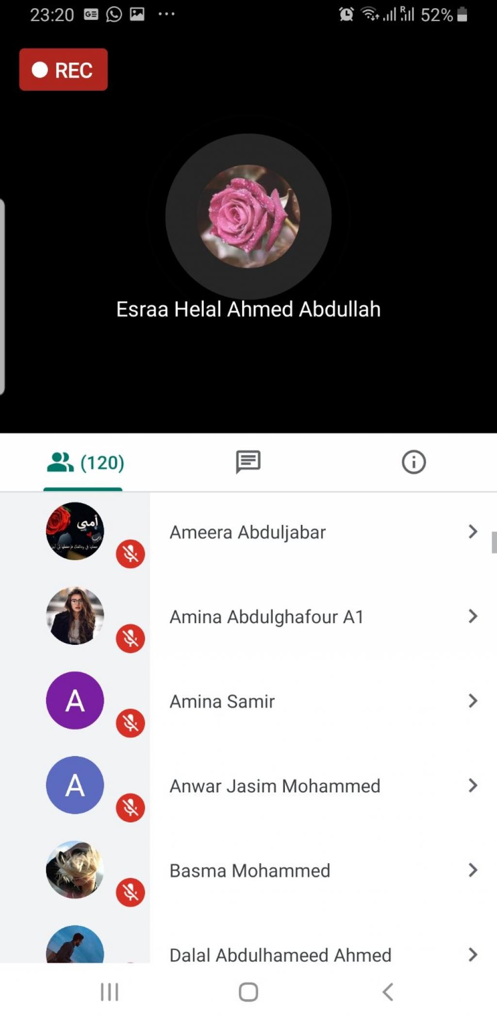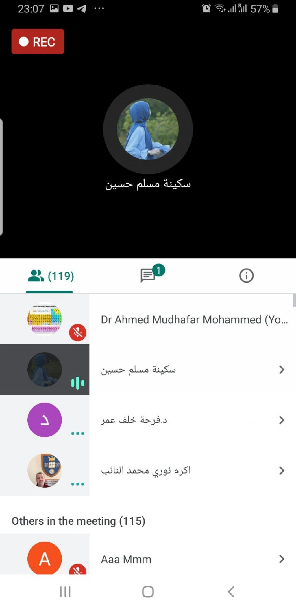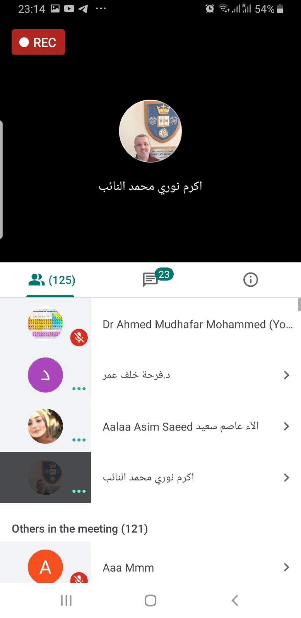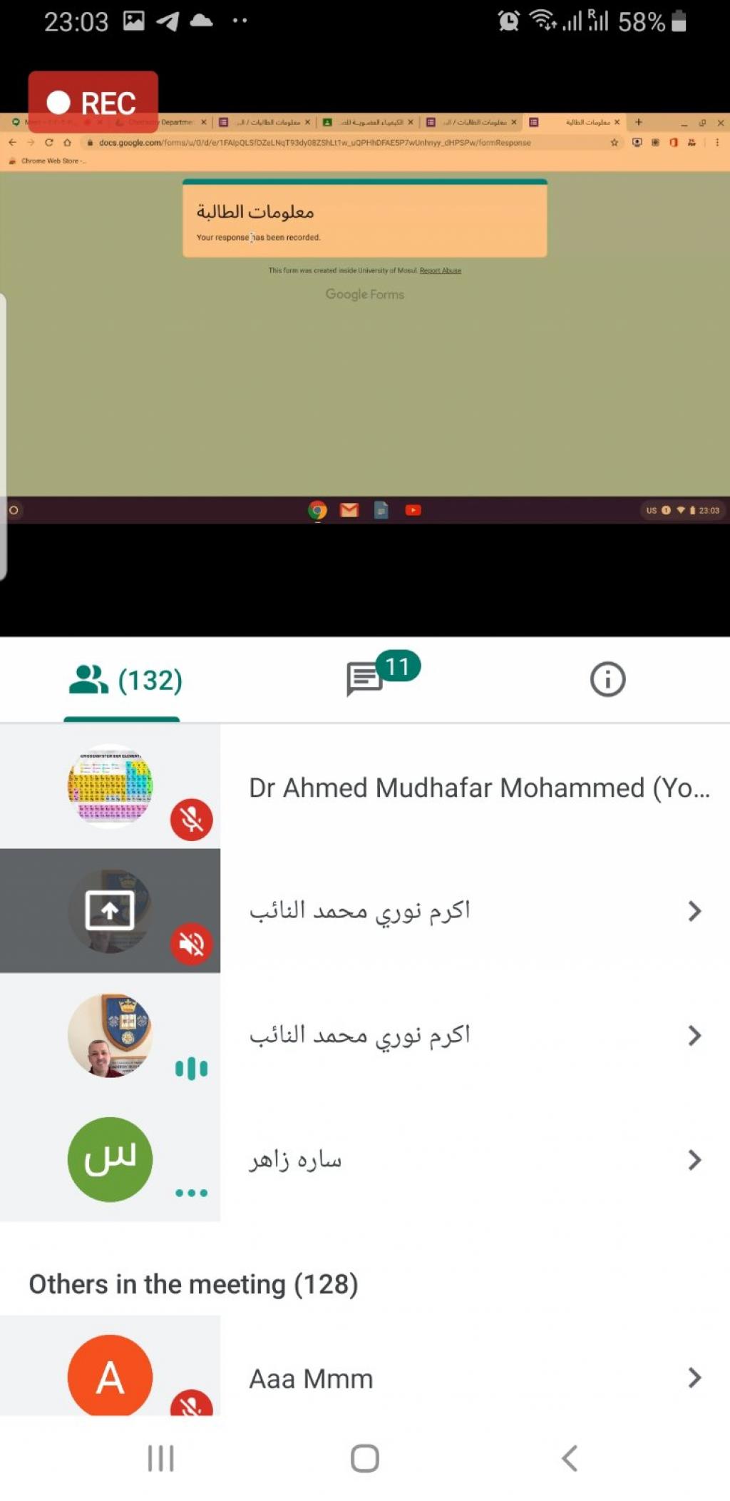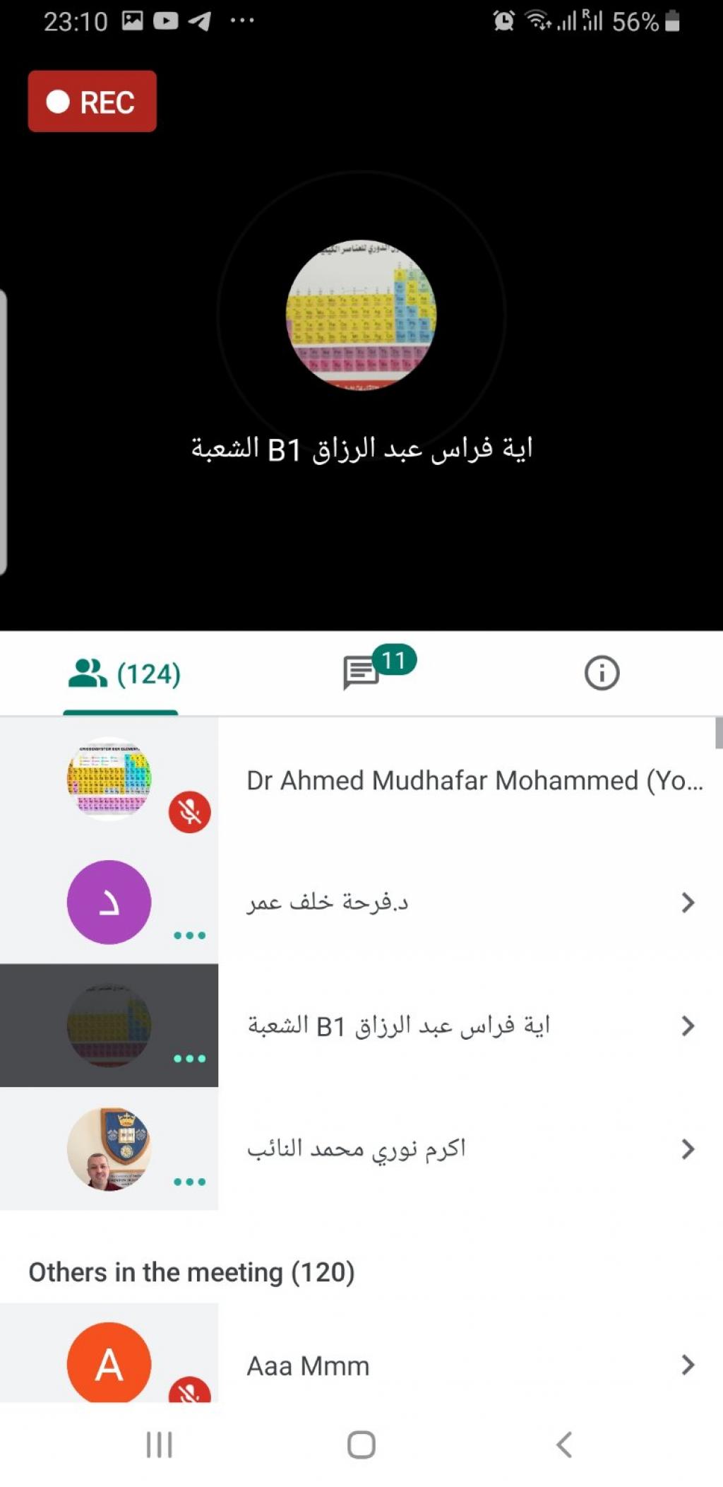 ضمن اهتمامات ومتابعة الطالبات ورفع همتهم لتجاوز هذه الازمة ،، التقت السيدة رئيس قسم الكيمياء أ.م.د. فرحة خلف عمر يوم السبت الموافق 6 حزيران ٢٠٢٠ طالبات المرحلة الاولى وممثلات الشعب للمرحلة الثانية والثالثة والرابعة وبحضور السيد مقرر قسم الكيمياء د. اكرم نوري النائب ومسؤول الإعلام في القسم د. أحمد مظفر محمد.كان الهدف من اللقاء رفع الهمم والمعنويات لطالباتنا العزيزات وابلاغهم بأحدث التعليمات والتوجيهات وحثهم على مواصلة الدراسة والتواصل العلمي الالكتروني من أجل تجاوز الازمة الحالية واكمال عامهن الدراسية وتَكَللهِ بالنجاح. استمعت السيدة رئيس القسم بعد ذلك لمداخلات الطالبات واجابة عن استفسارتهن للوقوف على المشاكل اللاتي تعتريهن والعمل على حلها ان شاء الله.العديد من الطالبات شاركن بكلمة شكر وثناء لرئاسة قسم الكيمياء وكافة تدريسي القسم لحسن تواصلهم وتعاملهم ومساعدتهم للطالبات.