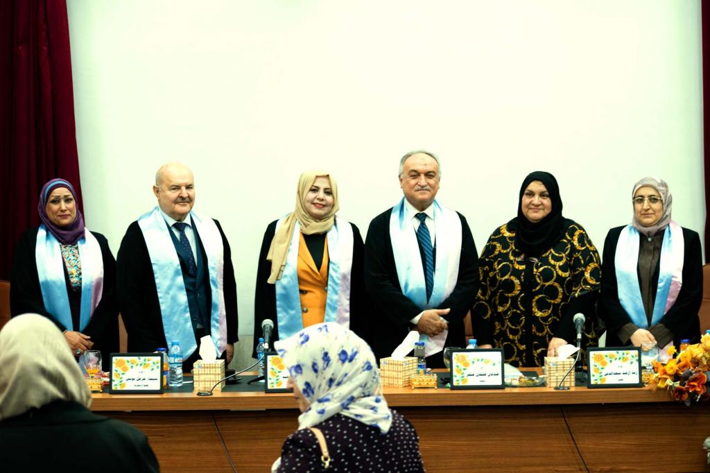 ناقش قسم الكيمياء بكلية التربية للبنات في جامعة الموصل رسالة الماجستير الموسومة ( تحضير عدد من المركبات الحلقية غير المتجانسة الجديدة ) ، للطالبة منى صبحي عبدالله ، يوم الخميس الموافق ٢٧ / ١٠ / ٢٠٢٢ ، في قاعة الخوارزمي في كلية هندسة الالكترونيات .استخدمت الباحثة وحدة الثايواميد (فنيل ثايويوريا) بوصفها وحدة بنائية فعالة في تحضير مدى واسع من المركبات الحلقية غير المتجانسة ، باستخدام الطرائق التقليدية المعروفه وبعض تقنيات الكيمياء الخضراء الحديثة ودراسة سلوكها الكيميائي من خلال الدراسات الطيفية لجميع المركبات المحضرة مع إجراء الفعالية البايولوجية لبعضها.واستخدمت مادة الثايواميد المتمثلة بالمادة فنيل ثايويوريا بوصفها الوحدة البنائية الرئيسة في هذه الرسالة، حيث اعتمدت في تحضير سلاسل مختلفة ومتنوعة من المركبات الحلقية غير المتجانسة الخماسية والسداسية الحلقة ، عبر أربعة مسارات مختلفةوقيست الفعالية البايولوجية لعدد من المركبات تجاه عدد مختلف الفطريات و كانت نتائج مقبولة.وتألفت لجنة المناقشة من الأساتذة :١- الأستاذ الدكتور عدنان عثمان عمر رئيساً.٢- الأستاذ المساعد الدكتور شاكر محمود سعيد عضواً.٣- المدرس الدكتورة رند ارشد سعدالدين عضواً.٤- الأستاذ المساعد الدكتورة شيماء خزعل يونس عضواً ومشرفاً.وبعد مناقشة علمية مستفيضة ودفاع الطالبة عن رسالتها اجيزت بتقدير امتياز.
