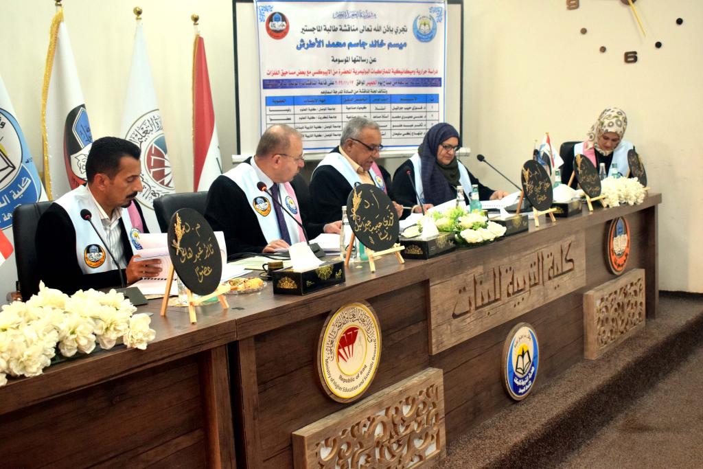 ناقش قسم علوم الكيمياء بكلية التربية للبنات في جامعة الموصل رسالة الماجستير الموسومة (دراسة حرارية وميكانيكية للمتراكبات البوليمرية المحضرة من الايبوكسي مع بعض مساحيق الفلزات ) ، للطالبة ميسم خالد جاسم الأطرش ، يوم الخميس الموافق ١٧ / ١١ / ٢٠٢٢ ، في قاعة المناقشات والمؤتمرات بمبنى عمادة الكلية .هدفت هذه الرسالة إلى تحضير مجموعة من المتراكبات البوليميرية لراتنج الإيبوكسي بوصفه مادة اساس مضافاً إليها مواد مدعمة ( برادة الحديد, برادة الألمنيوم, برادة النحاس ) وبنسب وزنية مختلفة, لتقييم أداء هذه المتراكبات البوليميرية دُرِست بعض الخواص الميكانيكية والحرارية والفيزيائية لهذه المتراكبات وأيضاً دُرِس التأثير الحراري على سلوك تلك المتراكبات عند المعالجات الحرارية (8,25,55) °م وتمثلت الاختبارات الميكانيكية ب(مقاومة الصدمة ,مقاومة الصلادة ,مقاومة الانضغاطية والمرونة) اما الاختبارات الحرارية فتمثلت باختبار التوصيل الحراري, ايضا درست صفاتها الحرارية باستخدام تقنيات التحليل الحراري الوزني ذي الحرارة المتغيرة (TGA), وتقنيات التحليل الحراري الوزني ذي الحرارة الثابتة (IGA).أثبتت النتائج العملية أن زيادة النسب الوزنية لمواد التدعيم يؤدي إلى زيادة الخواص الميكانيكية والحرارية والفيزيائية التي ذكرت بعد عملية التدعيم نسبة إلى مادة الاساس قبل التدعيم, وتختلف هذه الزيادة باختلاف أشكال مواد التدعيم المضافة ومتانتها وكيفية توزيعها داخل المادة الاساس ,ايضا طبيعة سطوح مواد التدعيم لها دور مهم في تباين تلك الخواص.وعند معالجة المتراكبات البوليمرية في الدرجات الحرارية (55,25,8)م. لوحظ انخفاض في قيم كل من (مقاومة الصلادة والانضغاطية والمرونة( بارتفاع درجات الحرارة أي عند 55°م, بعكس قيم مقاومة الصدمة التي زادت بزيادة درجة الحرارة .أما بالنسبة للخواص الحرارية (التوصيل الحراري ) يزداد معامل التوصيل الحراري للإيبوكسي بعد عملية التدعيم بصورة عامة وبشكل متفاوت عند زيادة درجة الحرارة.وبالنسبة لقياسات التوصيل الكهربائي يزداد التوصيل الكهربائي للإيبوكسي بعد عملية التدعيم وأن اعلى قيمة كانت للإيبوكسي المدعم ببرداة الحديد والنحاس لذا تعتبر المواد البوليمرية من المواد شبه الموصلة.وتألفت لجنة المناقشة من الأساتذة :١- الأستاذ الدكتور فوزي حبيب جبرائيل رئيساً.٢- الأستاذ المساعد الدكتور علي عميري محمد عضواً.٣- المدرس الدكتور ثائر عبد هلو عضواً.٤- الأستاذ الدكتورة ابتهاج زكي سليمان عضواً ومشرفاً.وبعد مناقشة علمية مستفيضة ودفاع الطالبة عن رسالتها أجيزت بتقدير امتياز.