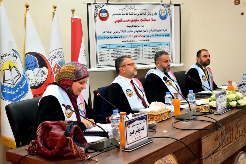 ناقش قسم اللغة العربية بكلية التربية للبنات في جامعة الموصل رسالة الماجستير الموسومة ( اشتراك الجذور الثنائية في الأصول الدلالية في مقاييس اللغة لابن فارس المتوفى ٣٩٥ للهجرة) ، للطالبة علا عبدالسلام سليمان النعيمي ، يوم الثلاثاء الموافق ١٣ / ١٢ / ٢٠٢٢ ، في قاعة المناقشات والمؤتمرات بمبنى عمادة الكلية .تناولت هذه الدراسة المعجمية الجذور الثنائية التي اشتركت واتفقت في أصول وضعها ابن فارس لتلك الجذور في معجمه مقاييس اللغة، وقد بَيَّنت الدراسة تقارب معاني الكلمات بالرغم من اختلاف المباني ، ووقفت الدراسة على 57 أصلًا دلاليًا اشتركت فيها الجذور، وقد تباينت أعداد الجذور في اشتراكها واتفاقها في الأصل الواحد؛ إذ إن أغلب الورود كان في اتفاق جذرين في أصل دلالي، وبلغ أقصاه عند اشتراك ستة عشر جذرًا في الأصل الدلالي الواحد، وقد بينت الدراسة التشابه بين ألفاظ الجذور المختلفة واشتقاقاتها في التماس الأصل الدلالي فيها من جهة وبينا الفروق بين اشتقاقات الجذور المختلفة؛ إذ إن منها ما دل على الحقيقة فحسب ومنها ما دل على الحقيقة وعلى المجاز، ومنها ما دل على المعاني الحسية ومنها ما يدل على الحسية والمعنوية معا .وتألفت لجنة المناقشة من الأساتذة :١- الأستاذ الدكتور محمد ذنون يونس رئيساً.٢- الأستاذ المساعد الدكتور أيمن عبدالله أحمد عضواً.٣- الأستاذ المساعد الدكتورة دعد يونس حسين عضواً.٤- الأستاذ المساعد الدكتور إدريس سليمان مصطفى عضواً ومشرفاً.وبعد مناقشة علمية مستفيضة ودفاع الطالبة عن رسالتها أجيزت بتقدير امتياز.