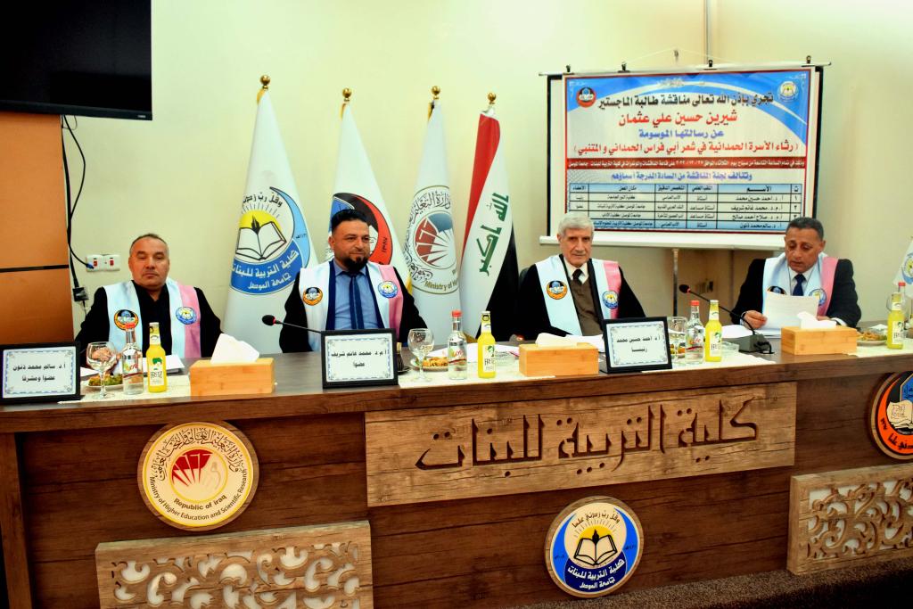 ناقش قسم اللغة العربية بكلية التربية للبنات في جامعة الموصل رسالة الماجستير الموسومة (رثاء الأسرة الحمدانية في شعر أبي فراس الحمداني والمتنبي) ، للطالبة شيرين حسين علي، يوم الثلاثاء الموافق ٢٧ / ١٢ / ٢٠٢٢ ، في قاعة المناقشات والمؤتمرات بمبنى عمادة الكلية .تضمنت هذه الدراسة الوصفية التحليلية موضوع الرثاء لدى شاعرين كبيرين هما ابو الطيب المتنبي وابو فراس الحمداني وقد اشتمل الموضوع على بيان تعاريف الرثاء لغة واصطلاحا وكذلك تقسيم شعر الرثاء إلى ثلاثة اقسام ألا وهي الندب والتأبين والعزاء.. وتناولتالرسالة رؤية الموت عند الشاعرين اي علاقة الشاعر بالموت، وصور الرثاء التي اخذت أبعادا خاصة تنوعت بين الندب والتأبين والعزاء، وابعاد الرثاء بكل ما أتخذته من ابعاد نفسية واجتماعية ودينية..فالرثاء فن شعري لصيق بالنفس الإنسانية وهو أصدق تعبير عن الفقد، سواء أكان المفقود ابا ام اما ام حبيبا ام اخا ام صديق ام زوجة ام ولدا…وتألفت لجنة المناقشة من الأساتذة :١- الأستاذ الدكتور أحمد حسين محمد رئيساً.٢- الأستاذ المساعد الدكتور محمد غانم شريف عضواً.٣- الأستاذ المساعد الدكتور صلاح احمد صالح عضواً.٤- الأستاذ الدكتور سالم محمد ذنون عضواً ومشرفاً.وبعد مناقشة علمية مستفيضة ودفاع الطالبة عن رسالتها أجيزت بتقدير مستوف