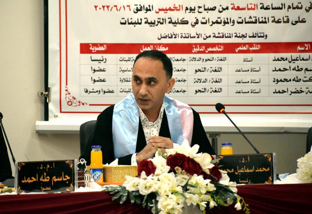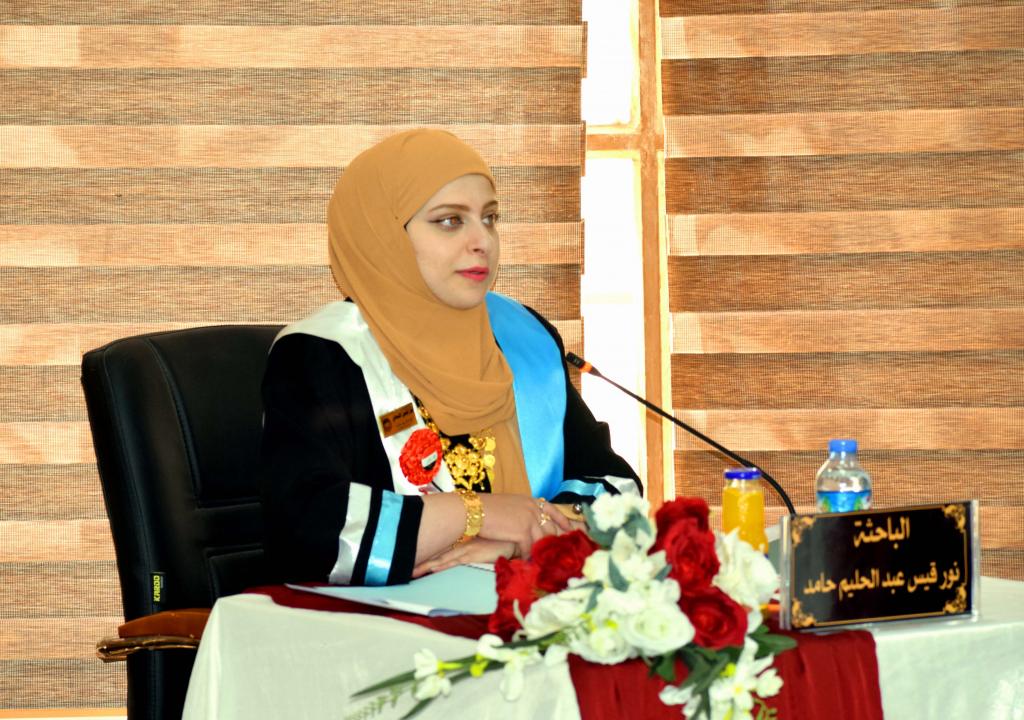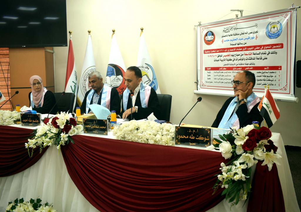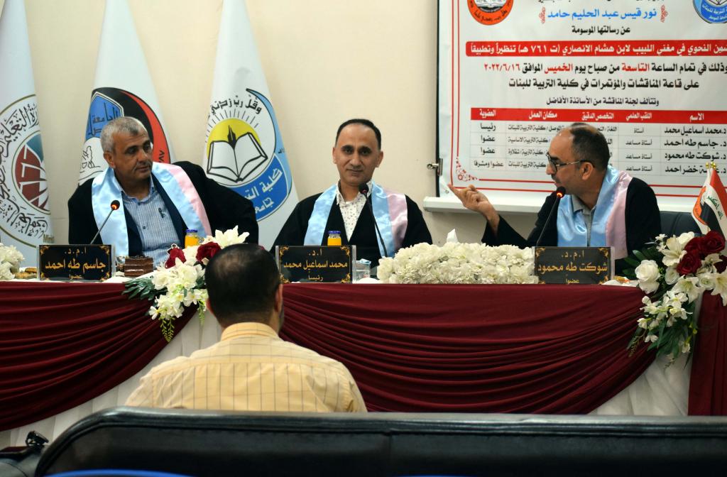 رسالة ماجستير في تخصص اللغة العربية ..ناقشت كلية التربية للبنات / قسم اللغة العربية في جامعة الموصل رسالة الماجستير الموسومة (التضمين النحوي في مغني اللبيب لابن هشام الأنصاري ت٧٦١هجرية تنظيرا وتطبيقا ) للطالبة (نور قيس عبد الحليم حامد)، يوم الخميس الموافق ١٦ / ٦ / ٢٠٢٢، في قاعة المناقشات والمؤتمرات في الكلية.وحضر جانبا من المناقشةِ السيدان معاونا العميد للشؤون العلمية والإدارية وعدد من أساتذة القسم ..تناول البحث في التمهيد تنظيراً لموضوع التضمين في اللغة والاصطلاح، ومفهوم التضمين عند ابن هشام، فضلاً عن مسائل أخرى على صلة بالتضمين كالتضمين والنيابة، والتضمين والسماع والقياس وغيرها، أما الفصول فجاءت علی النحو الآتي:- الفصل الأول جاء بعنوان (التضمين في الفعل المتعدي) الذي قُسِم بدوره على مبحثين، أحدهما: تضمين الفعل المتعدي معنى فعل متعدٍ إلى مفعول أو أكثر، والثاني حمل عنوان: تضمين الفعل المتعدي معنى فعل لازم أو متعدٍ بحرف.- الفصل الثاني: تناول (التضمين في الفعل اللازم) وقُسِم على مبحثين، الأول: تضمين الفعل اللازم معنى فعلٍ متعدٍ بحرف أو فعل متعدٍ بنفسه. في حين تناول المبحث الثاني تضمين الفعل المتعدي بحرف معنى فعل متعدٍ بحرف أو متعدٍ بنفسه.وقد اشتمل كل مبحث من مباحث الفصول المذكورة علی توضيح للمفاهيم المطروقة في المباحث، وعلی تحليل وتطبيق للشواهد التي صرح بها ابن هشام في كتابه المغني بوجود تضمينٍ فيها.وقد انتهت الرسالة بخاتمة شملت اهم النتائج التي توصلت اليها الدراسة، وسبقت بجداول احتوت علی الالفاظ التي صرح ابن هشام بوجود تضمين فيها.وتألفت لجنة المناقشة من الأساتذة :١- أ.د. محمد إسماعيل المشهداني ….. رئيسا٢- أ.م.د. جاسم طه أحمد …… عضوا٣- أ.م.د. شوكت طه محمود ……عضوا٤- أ.م.د. عائشة خضر أحمد …عضوا ومشرفاوبعد مناقشة علمية مستفيضة في محتوى الرسالة ودفاع الطالبة عنها أجيزت بتقدير ممتاز .