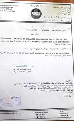 منح السيد رئيس الجامعة الاستاذ الدكتور أبي سعيد الديوه جي الاستاذ المساعد الدكتورة فرحة خلف رئيسة قسم الكيمياء كتاب شكر ، وذلك لجهودها المتميزة في نشر بحث علمي في مجلة رصية ذات معامل تأثير Impact Factor.. متمنين للدكتورة فرحة خلف المزيد من التقدم والعطاء والتفوق.