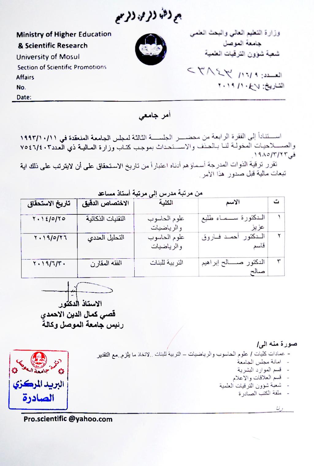 صدور الأمر الجامعي بترقية الدكتور صالح ابراهيم الى مرتبة استاذ مساعد