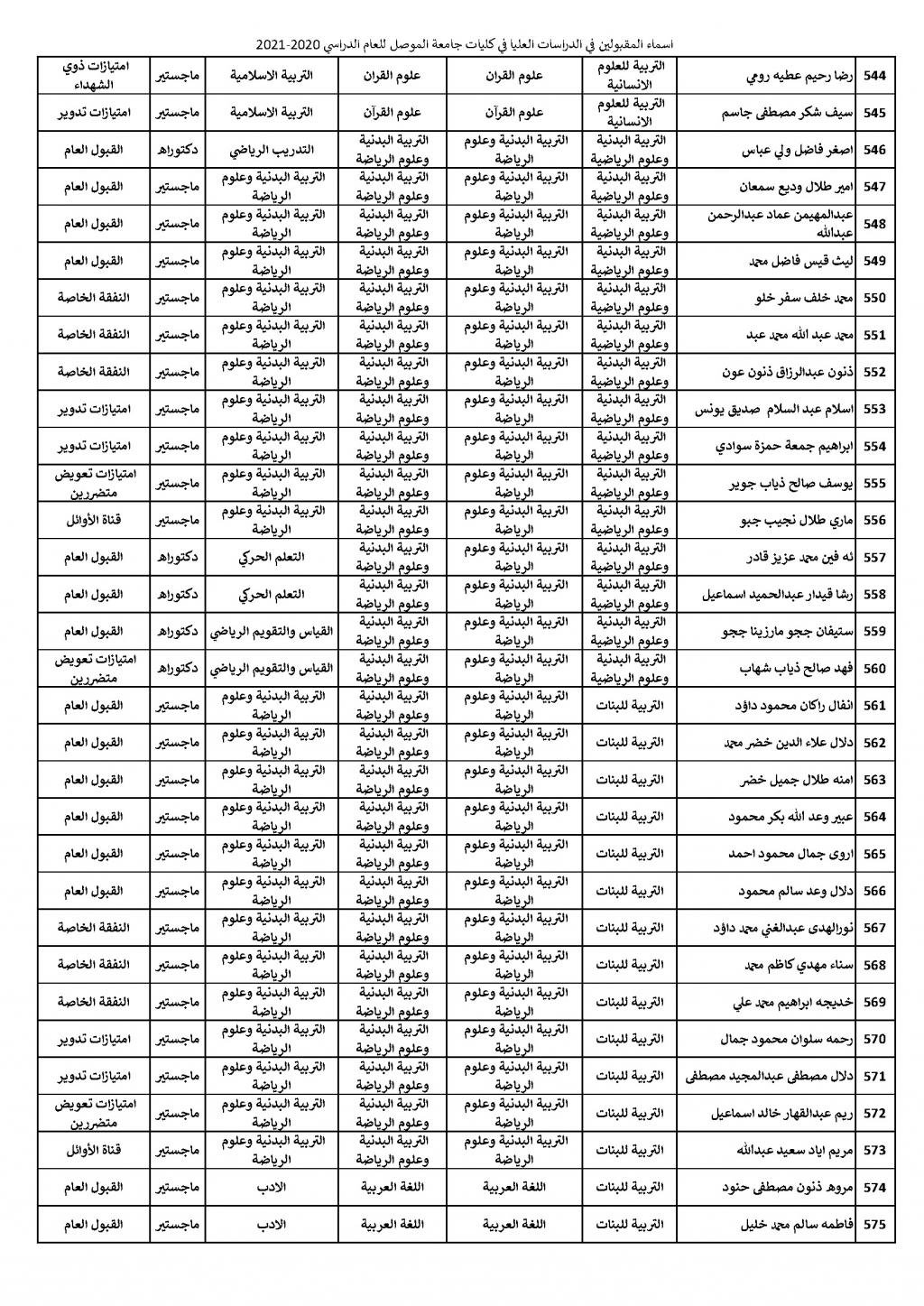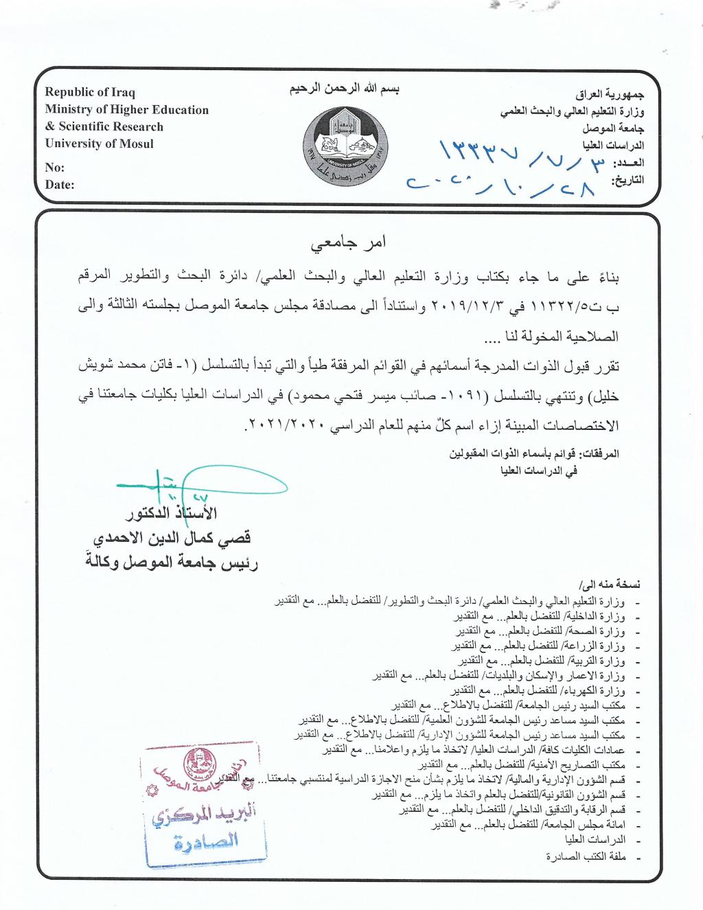 صدور الامر الجامعي الخاص باسماء الطالبات المقبولات في الدراسات العليا للعام الدراسي 2020-2021
