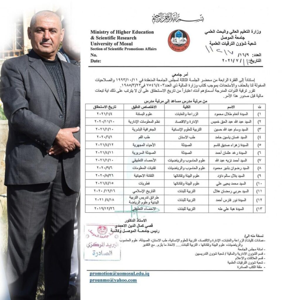 صدور الامر الجامعي بترقية تدريسية من قسم علوم القرآن والتربية الاسلامية