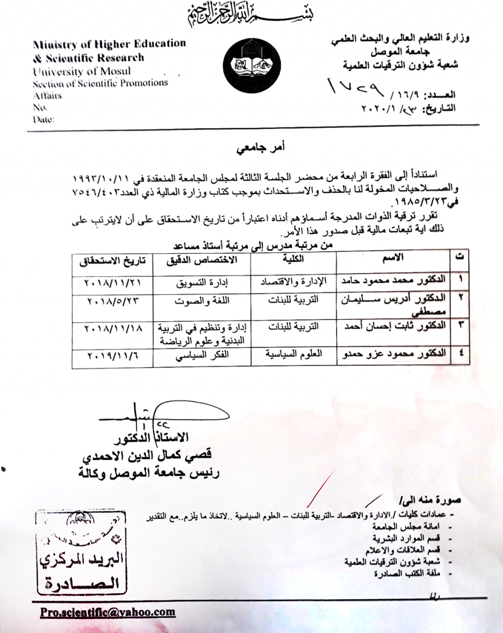 صدر الامر الجامعي الخاص بترقية الدكتور إدريس سليمان مصطفى (مقرر قسم اللغة العربية) والدكتور ثابت إحسان حمودات (مقرر قسم التربية البدنية وعلوم الرياضة) الى مرتبة استاذ مساعد، كل التوفيق لاساتذة الكلية في مشوارهم العلمي والعملي.
