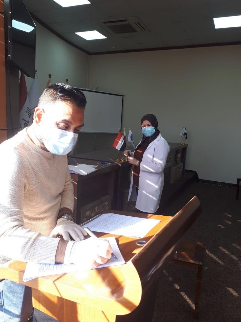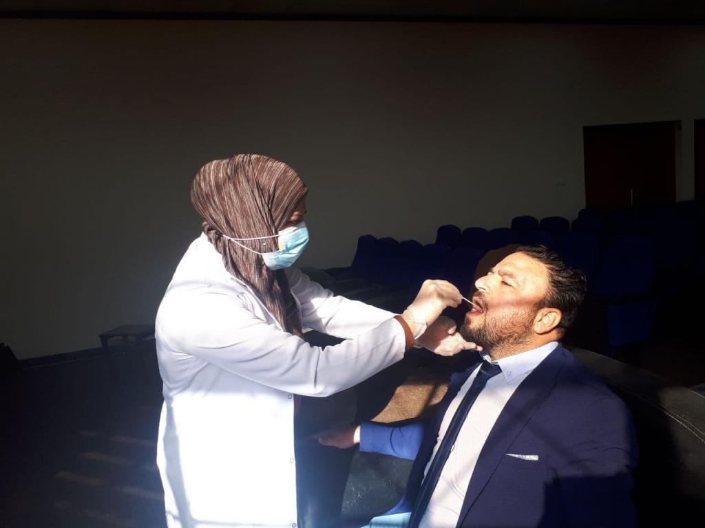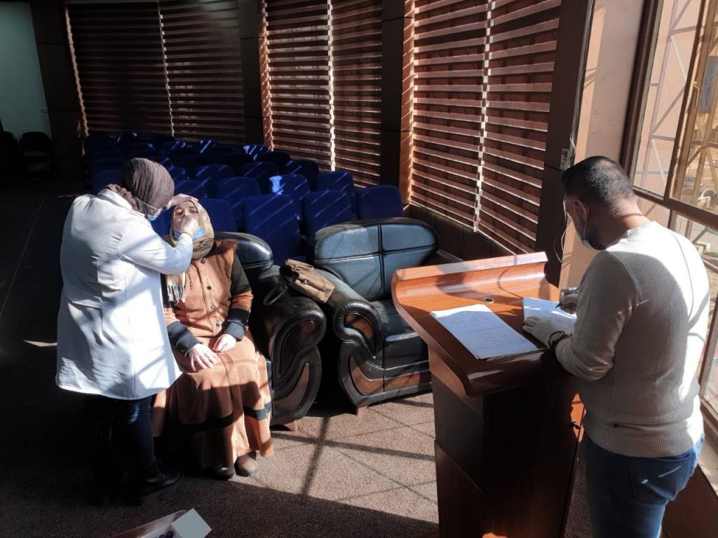 فريق من المركز الصحي الجامعي يجري فحص لاختبار فايروس كورونا لعدد من الكادر الوظيفي والتدريسي للكلية