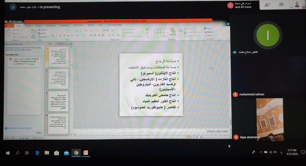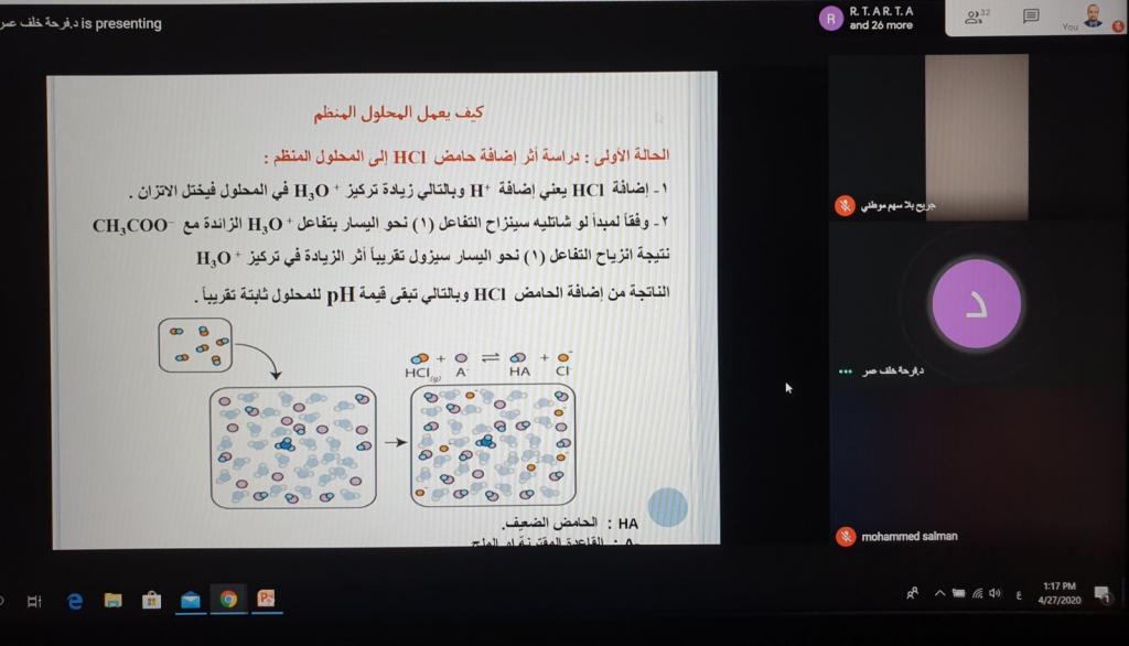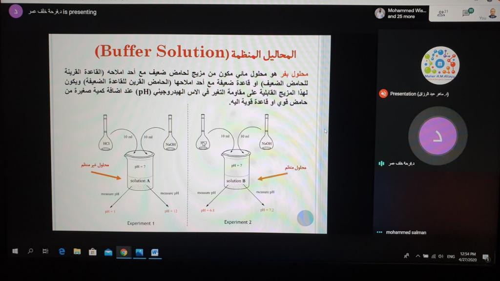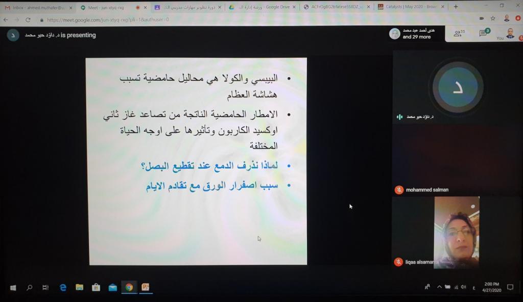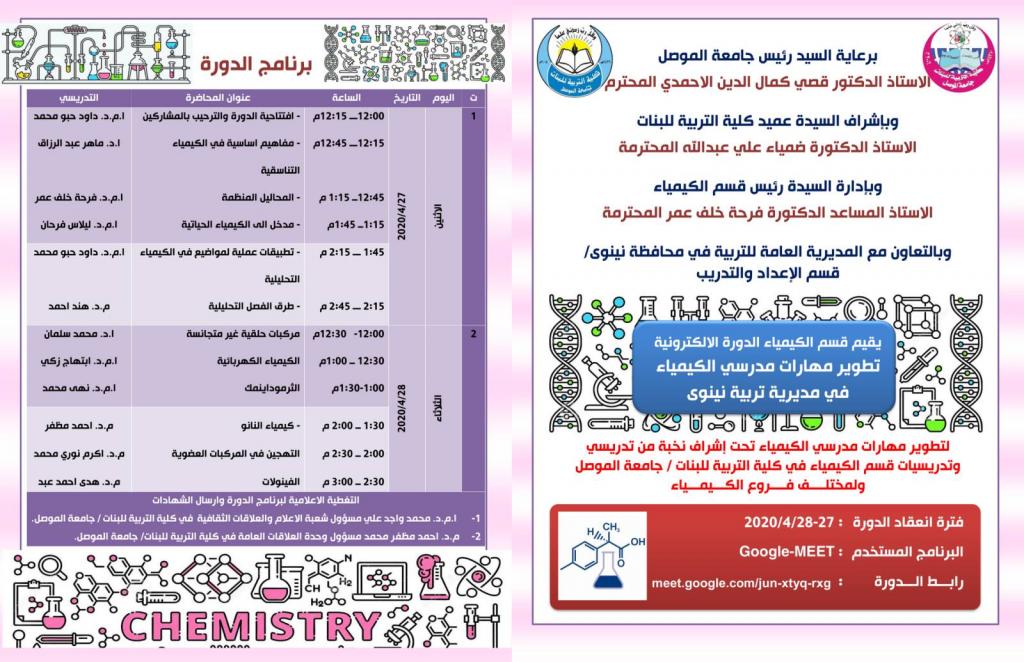 استناداً الى توجيهات رئاسة جامعة الموصل من اجل التعاون المشترك والتواصل العلمي المستمر مع المجتمع وبرعاية عمادة كلية التربية للبنات متمثلة بالسيدة عميد الكلية أ.د. ضمياء علي عبد الله المحترمة وبحضور السيدة رئيس قسم الكيمياء أ.م.د.فرحة خلف عمر المحترمة، بدأت يوم الاثنين ٢٧ نيسان ٢٠٢٠ اعمال اليوم الاول للدورة التدريبية العلمية الالكترونية الاولى لتطوير مهارات مدرسي الكيمياء في مديرية تربية نينوى والتي يُقيمها قسم الكيمياء في كلية التربية للبنات/ جامعة الموصل وبالتعاون مع مديرية تربية نينوى/ قسم الإعداد والتدريب، حيث بدا الدكتور داود بكلمة ترحيبية بالسادة والسيدات المشاركين مبيناً فيها اهمية مثل هذه الدورات وما تعود عليه بالنفع لمدرسي ومدرسات الكيمياء في مديرية تربية نينوى، ثم قدم اساتذة قسم الكيمياء محاضراتهم وكما مبينة في برنامج الدروة ادناه:.