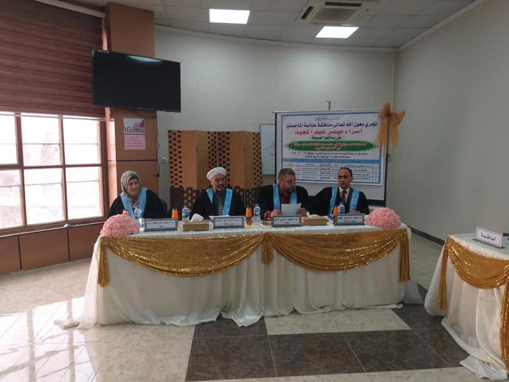 جرت بعون الله تعالى في جامعة الموصل بكلية التربية للبنات / قسم اللغة العربية مناقشة طالبة الماجستير إسراء ميسر عبد المجيد عن رسالتها الموسومة بـ : (الإيحاء الصوتي في مشاهد إهلاك الأمم السابقة في القرآن الكريم) ، يوم الخميس الموافق ٢٨-١١-٢٠١٩، على قاعة أ.د. خولة آل فليح، وقد حصلت الباحثة على درجة إمتياز.و تألفت لجنة المناقشة من الأساتذة :1. أ.د. عبد الكريم علي المغاري …..رئيساً2. أ.م.د. فيصل مرعي حسن…عضواً3. أ.م.د. هديل عبد الحليم داود …..عضواً4. أ.د. محمد إسماعيل المشهداني …. عضوا ومشرفافهنيئا للطالبة ومشرفها هذا المنجز العلمي المتميز