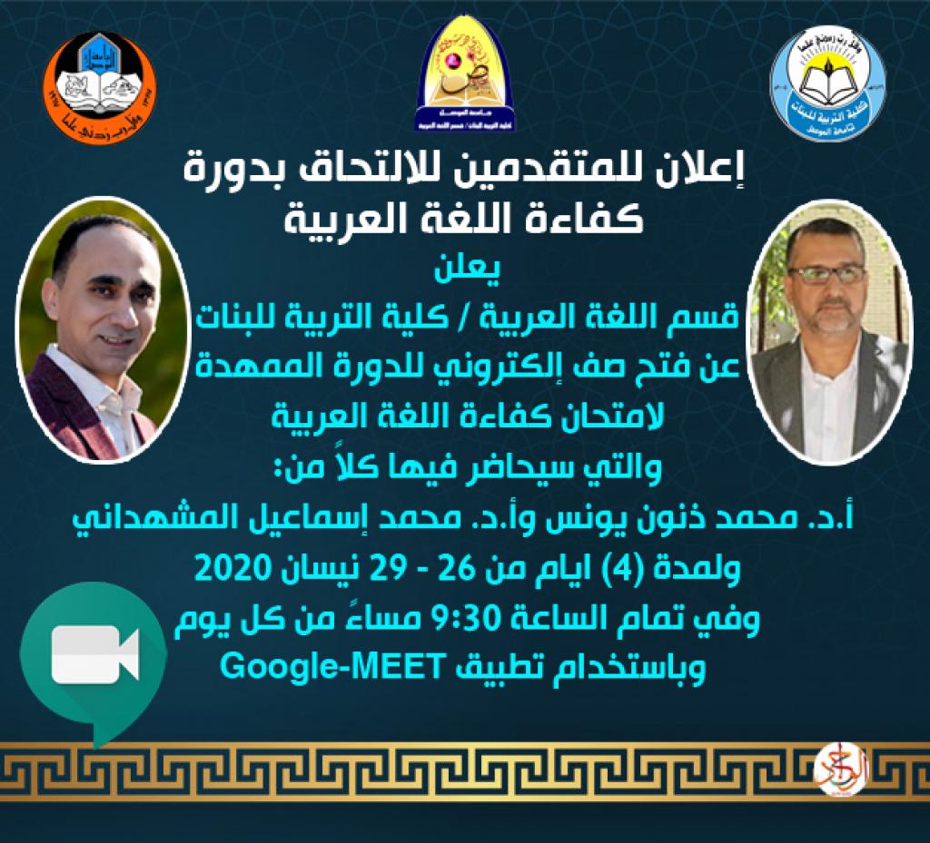 ضمن استعدادات جامعة الموصل لفتح التقديم للدراسات العليا، وبإشراف السيدة عميد كلية التربية للبنات أ.د. ضمياء علي عبدالله، وبإدارة السيد رئيس قسم اللغة العربية أ.م.د. عدنان عبدالسلام الاسعد أقام القسم دورة إلكترونية للتهيئ لاداء امتحان سلامة اللغة العربية التي تعد احد متطلبات التقديم لطلبة الدراسات العليا ولاغراض الترفيع لاعضاء الهيئة التدريسية في الجامعة، اذ بدأت الدورة يوم الاحد الموافق 26 نيسان 2020 وتستمر لمدة اربعة ايام عبر استخدام تطبيق Google-MEET، فقدم الاستاذ الدكتور محمد ذون محاضرته الاولى والموسومة بـ(اقسام الكلام) اذ تضمنت شرح الاحرف، والاسماء، والافعال، أاجاب بعدها الاستاذ المحاضر على اسئلة المشاركين الذين أبدوا تفاعلهم مع المحاضرة.