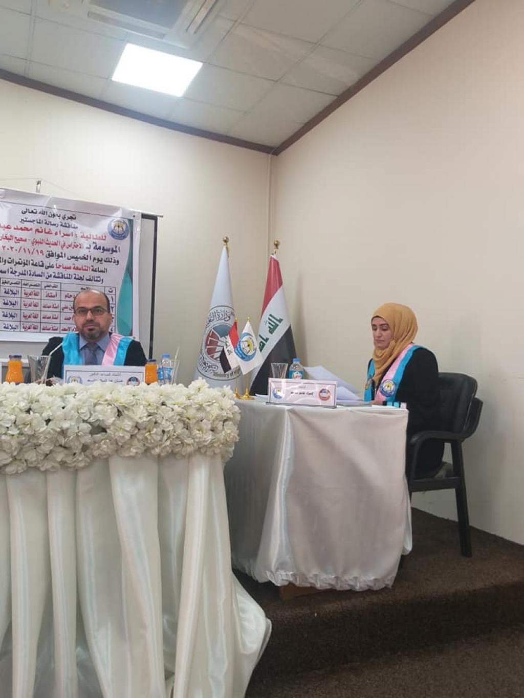وقد سلكنا في دراستنا للاحتراس في صحيح البخاري منهجاً بلاغياً تحليلياً مبنياً على قواعد البلاغة التي وضعها علماء البلاغة الأجلاء، سائرين بهذا المنهج على خطى من سبقنا في الدراسة البلاغية التحليلية، وجاء هذا المنهج البلاغي التحليلي؛ ليوضح بلاغة أسلوب الاحتراس في صحيح البخاري ويبين خصائص نظمه، ويكشف عن بعض أسراره القائمة على توجيه المعنى، ودفع توهم قد يراد لولا ذكره في الكلام. وبهذا يكتمل المنهج العام الذي سرتُ فيه باحثة عن الاحتراس في صحيح البخاري.وتألفت لجنة المناقشة من الأساتذة :1. أ.د. معن توفيق دحام …..رئيسا2. أ.م.د. عبد الوهاب حسين علي …عضوا3. أ.م.د. عمار إسماعيل أحمد …..عضوا4. أ.م.د. عدنان عبد السلام أسعد …عضوا ومشرفاوبعد مناقشة مستفيضة اجيزت الرسالة بتقدير ممتاز.. مبارك للطالبة ومشرفها وقسم اللغة العربية خصوصا وكلية التربية للبنات هذا المنجز العلمي المتميز وإلى مزيد من التقدم والنجاح