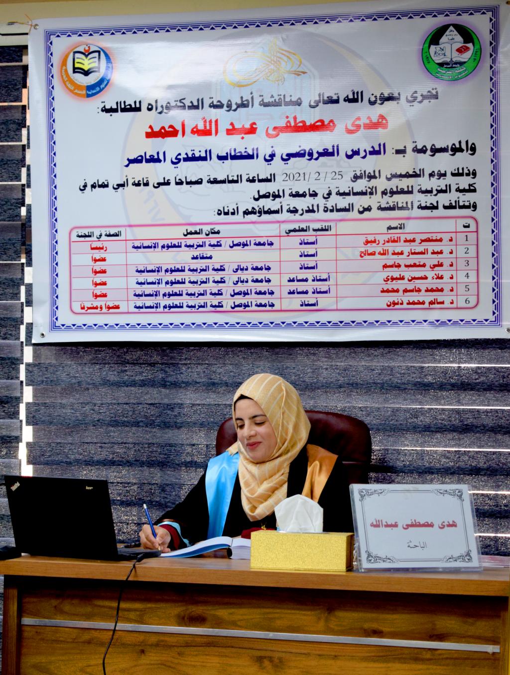 عمادة كلية التربية للبنات واساتذتها يحتفون بطالبات الكلية المتميزات، واللواتي حصلنّ على درجة الدكتوراه، فهو درس للوفاء يقدمه اساتذة قسم اللغة العربية لطالبته المتميزة والحاصلة على المرتبة الأولى في مرحلة البكالوريوس عام 2010، مع ترشيح بحثها الذي أعدته في المرحلة الرابعة تحت اشراف الاستاذ المساعد الدكتورة غيداء أحمد سعدون، ليفوز بالمرتبة الأولى في المسابقة الوزارية التي أُقيمت آنذاك متفوقة على طلبة جامعات القطر في ذات التخصص، فضلاً عن عملها في قسمها الذي تخرجت منه كمحاضرة مجانية لمدة ثلاث سنوات.فتم بعونه تعالى يوم الخميس الموافق ٢٥ شباط ٢٠٢١، اجراء مناقشة طالبة الدكتوراه “هدى مصطفى عبدالله أحمد” في أطروحتها الموسومة بـ( الدرس العروضي بين القدماء والمحدثين)، اذ اعتمدت الدراسة على منهج الاستقراء والتحليل والنقد، فهي تدور في فلك نقد النقد الذي يسعى لاستنتاج ما يدور في ذهن الناقدين من آراء، وكانت الخطة موزعة على ثلاثة فصول يسبقها تمهيد ويعقبها خاتمة، تضمن التمهيد علم العروض قبل الخليل بملامحه الفطرية، وفي الفصل الأول الموسوم (الأوزان القياسية) جاءت الدراسة فيه متناولة الآراء النقدية التي تدور حول البحور التي وضعها الخليل بصورها وتشكيلاتها المتعارف عليها، وكان الفصل الثاني مخصصاً لدراسة (الأوزان غير القياسية) فتطرقنا فيه إلى الصور الشاذة والنادرة والغريبة والأوزان الجديدة والصور المرفوضة والصور التي استدركها العروضيون على الخليل، وجاء الفصل الثالث يحمل عنوان (الأجزاء التكوينية للبحور) ويضم تشكيلات التفعيلات، وتحولات التفعيلات، والقافية، وتضمنت الخاتمة أبرز ما توصلت إليه دراستنا من نتائج على مدى صفحاتها.ترأس لجنة المناقشة أ.د. منتصر عبدالقادر رفيق، وعضوية كل من أ.د. عبدالستار عبدالله صالح ، أ.د. علي متعب جاسم، أ.م.د. علاء حسين عليوي، أ.م.د. محمد جاسم محمد، وبإشراف أ.د. سالم محمد ذنون،وبعد مناقشة علمية رصينة أجزيت الأطروحة ومنحت شهادة الدكتوراه وبتقدير (مستوف).
