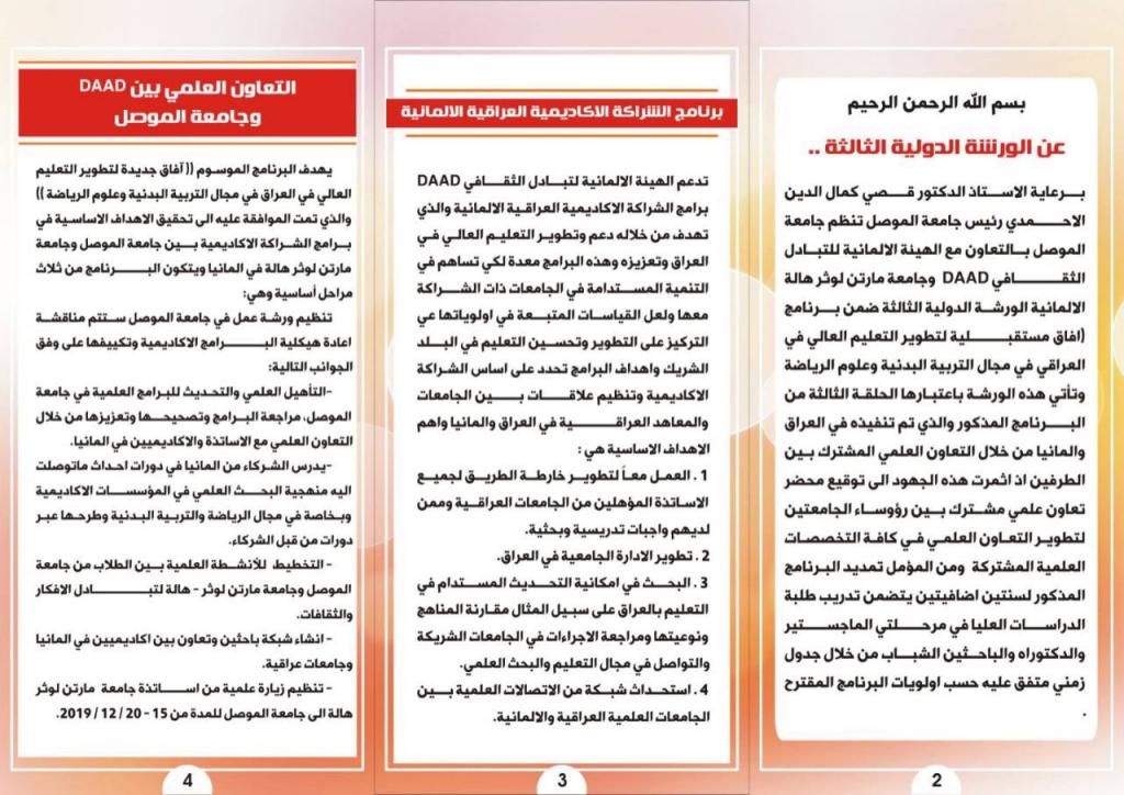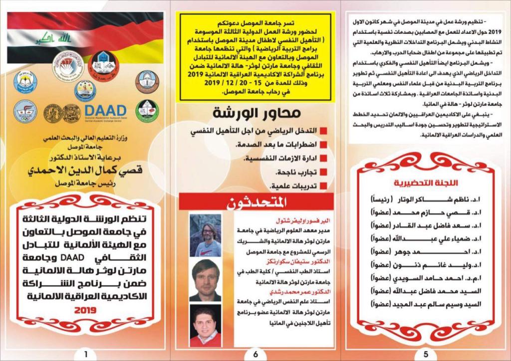 تشارك أ.د. ضمياء علي عبدالله رئيس قسم علوم الرياضة والتربية البدنية في اللجنة العليا التحضيرية لدورة “تأهيل اطفال مدينة الموصل باستخدام برامج التربية الرياضية” والتي تنظمها جامعة الموصل برعاية السيد رئيس جامعة الموصل أ.د. قصي كمال الدين الاحمدي وبالتعاون مع الهيئة الالمانية للتبادل الثقافي (DAAD) وجامعة مارتن لوثر، و بحضور مختصين من جامعة مارتن لوثر الالمانية وذلك للفترة من 15 ــ 20 / 12 / 2019 فعلى الراغبين من السادة التدريسيين والباحثين والمهتمين بالمشاركة في الورشة مراجعة قسم النشاطات الطلابية في جامعة الموصل للتسجيل وذلك للفترة من ١ إلى ١٠ / ١٢ / ٢٠١٩.
