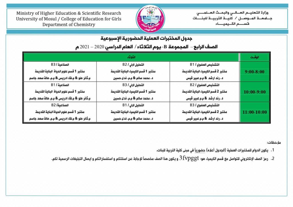 كلية التربية للبنات تعلن عن الجداول الدراسية للمواد النظرية والعلمية ولكافة الاقسامجداول قسم الكيمياء