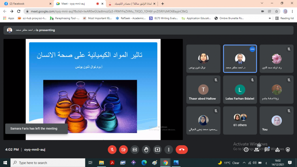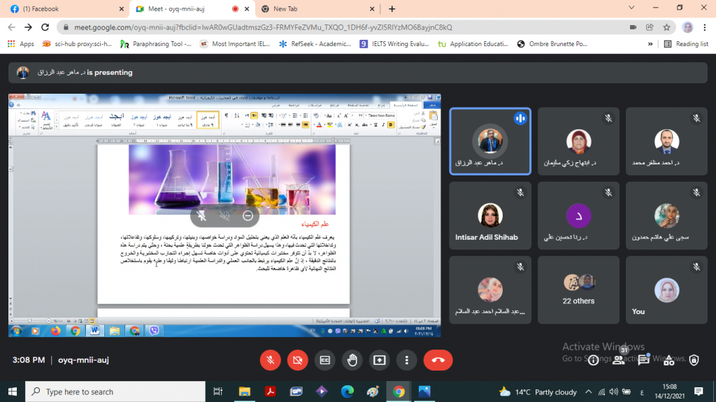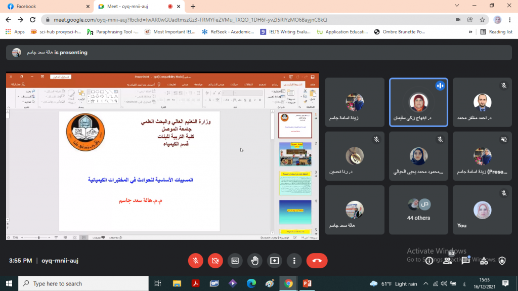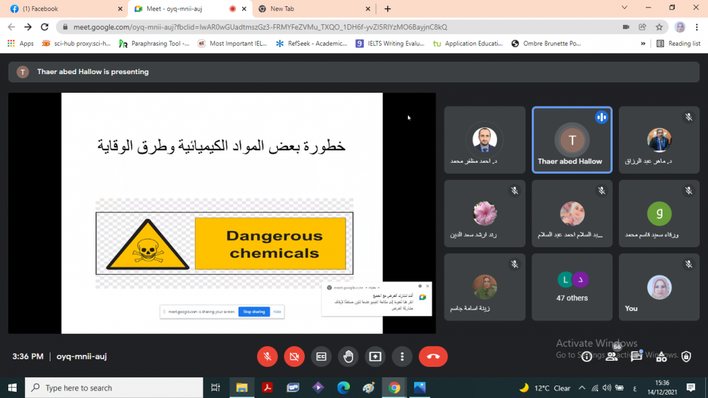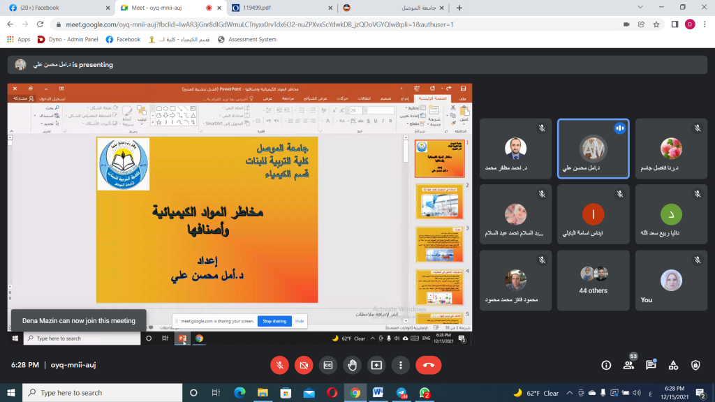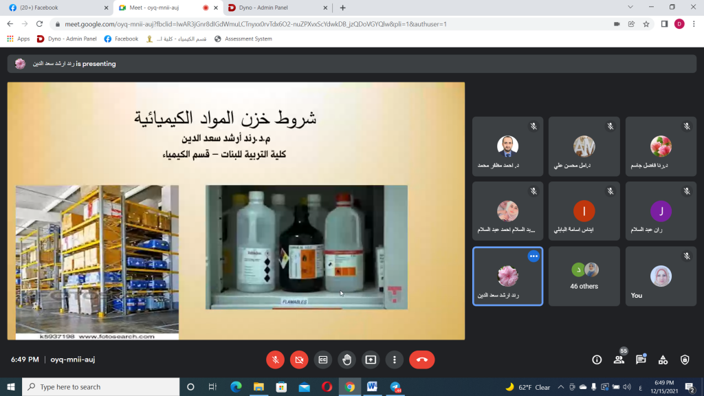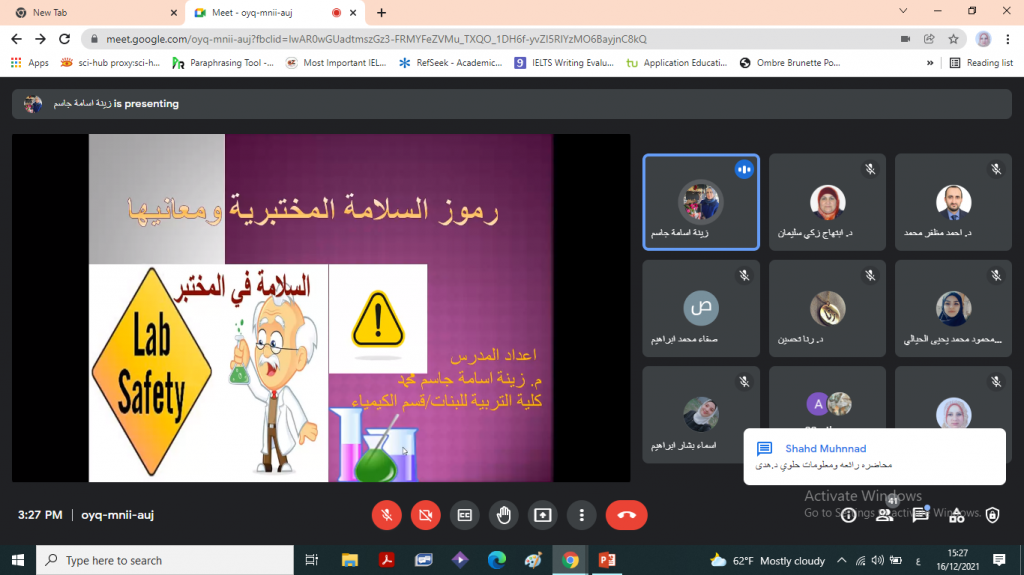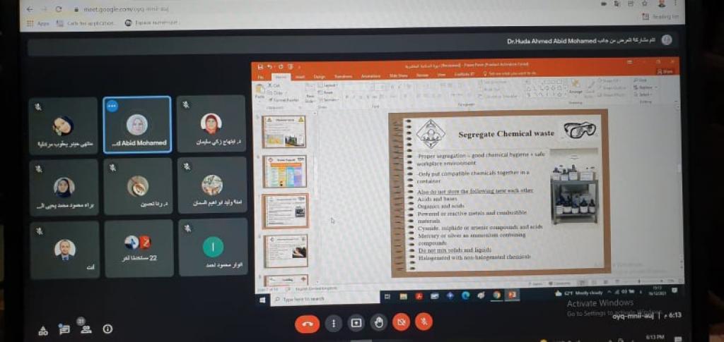 برعاية السيد رئيس جامعة الموصل الأستاذ الدكتور قصي كمال الدين الاحمدي و بإشراف السيدة عميد كلية التربية للبنات الأستاذ الدكتورة ضمياء علي عبد الله و بإدارة السيدة رئيس قسم الكيمياء الأستاذ الدكتورة ابتهاج زكي سليمان, أختتم قسم الكيمياء و بحضور عدد من تدريسي جامعة الموصل و طلاب الدراسات العليا الدورة العلمية الالكترونية الموسومة (مواقف و ممارسات سلامة المختبرات في البحث الكيميائي) و لمدة ثلاثة ايام للفترة 14- 16 كانون الاول 2021 و على منصة Google Meet.تناولت الدورة مواضيع عن اجراءات السلامة التي تمثل اهم النظم التي لا غنى عنها في اي مكان اذ لا بد ان يكون متبوعا لأقصى قواعد الامن و السلامة من خلال معرفة خطورة المواد الكيمياوية و طرق الوقاية منها و كيفية التعامل الامن مع المخلفات السائلة و الصلبة و التعرف على رموز السلامة و معانيها. أذ يجب توفير وسائل السلامة الأولية داخل المختبرات مثل مطافئ الحريق وصندوق الإسعافات الأولية ودش غسيل الطوارئ وأجهزة إنذار والاحتفاظ بها بمكان ظاهر وعمل صيانة دورية لها للتأكد من صلاحيتها. هدفت الدورة على مساعدة الطالب على فهم السلامة المختبرية المناسبة، وزيادة إدراكه للمخاطر أو المخاطر المحتملة التي تنطوي عليها أعمال المختبر، ولإدراك أن المختبر يعد مكانًا آمنًا للعمل إذا تم اتباع إرشادات السلامة بشكل صحيح.و من الجدير بالذكر يجب على العاملين في المختبرات ان يكون لهم المعرفة الكاملة عن أنواع معدات الوقاية المتاحة والاستخدام المناسب لكل نوع و الغرض الذي صممت من اجله من خلال عمل دورات تدريبية للطلبة قبل الشروع بالجزء العملي في مختبراتهم.