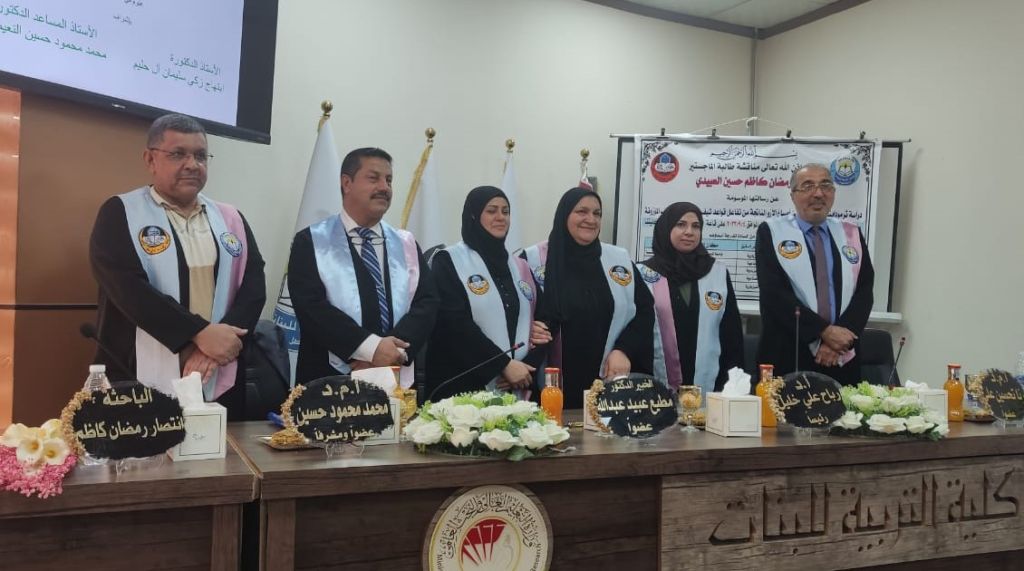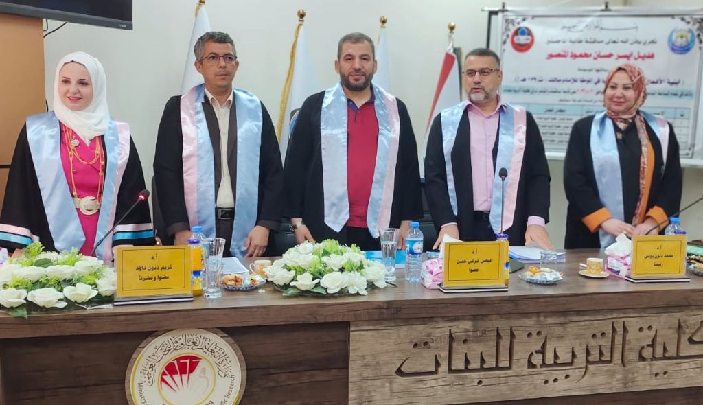 ترأس لجنة المناقشة الاستاذ المساعد الدكتور (فراس محمد بشير الخشاب) وعضوية كل من الاستاذ المساعد الدكتورة (وحدة عبدالرزاق محمود) والاستاذ المساعد الدكتورة (دنيا عبدالرزاق عبدالله) وعضوية واشراف الاستاذ الدكتورة رضاء ناظم حمّو.