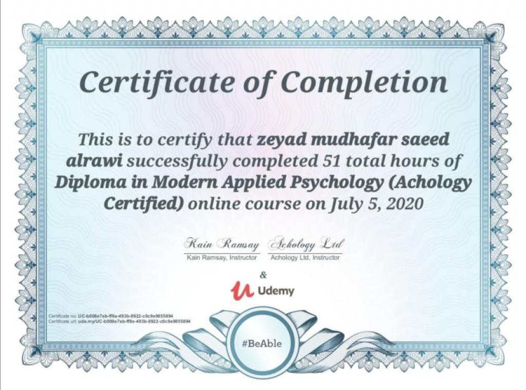 مؤسسة Udemy الامريكية تمنح شهادة دبلوم في العلوم النفسية التطبيقية الحديثة لتدريسي من قسم علوم القرآن والتربية الاسلامية