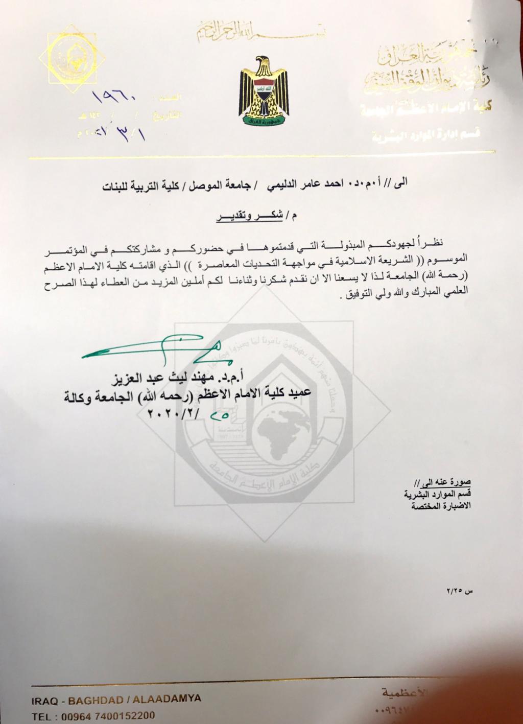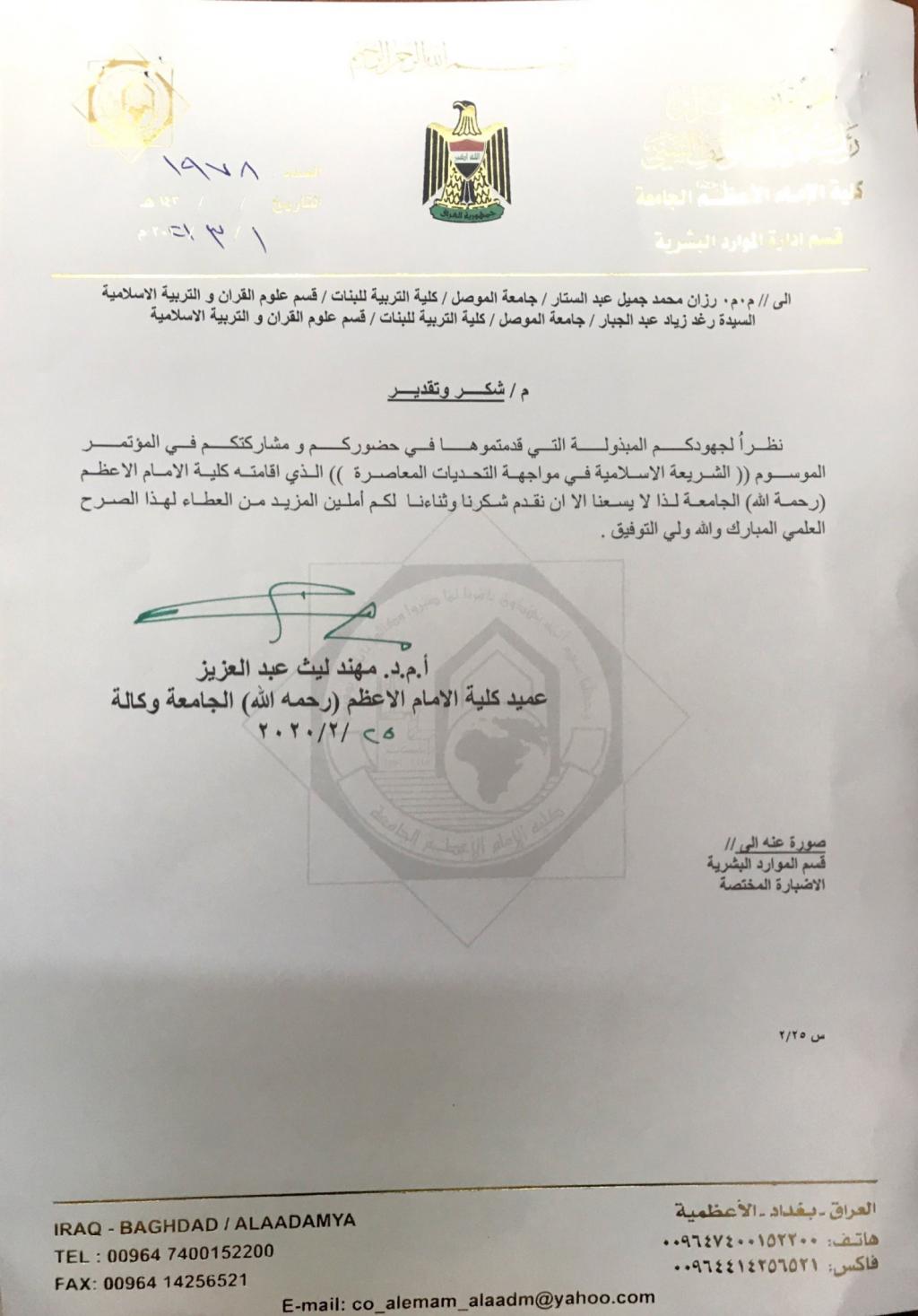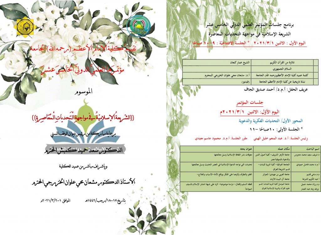 مشاركة استاذين واول طالبة من قسم علوم القرآن والتربية الاسلامية ببحث تخرجها في المؤتمر العلمي الدولي الخامس عشر والموسوم “الشريعة الإسلامية في مواجهة التحديات المعاصرة”