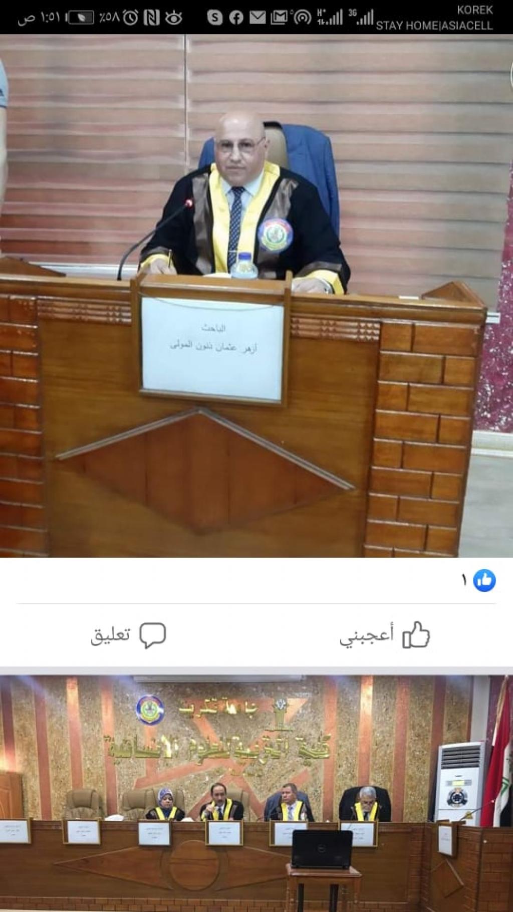 شاركت التدريسية الأستاذ المساعد الدكتورة أزهار يحيى قاسم في لجنة مناقشة اطروحة الدكتوراه الكترونيا عبر (برنامج سكايب)، في كلية التربية للعلوم الانسانية / جامعة تكريت، وذلك يوم الأحد الموافق 19 نيسان 2020 اذ تم مناقشة الطالب ازهر عثمان ذنون المولى في اطروحته الموسومة (الإساءة الوالدية كما يدركها الابناء وعلاقتها بالشفقة بالذات والافكار اللاعقلانية لدى طلبة المرحلة الاعدادية)، تألفت لجنة المناقشة من:أ.د حميد سالم خلف رئيساأ.د خشمان حسن علي عضواأ.د صباح مرشود منوخ عضواوأ.م.د أزهار يحيى قاسم عضواأ.م.د سرى اسعد جميل عضواأ.د اديب محمد نادر عضوا ومشرفاوتم قبول الاطروحة ومنح الطالب شهادة الدكتوراه وبتقدير امتياز