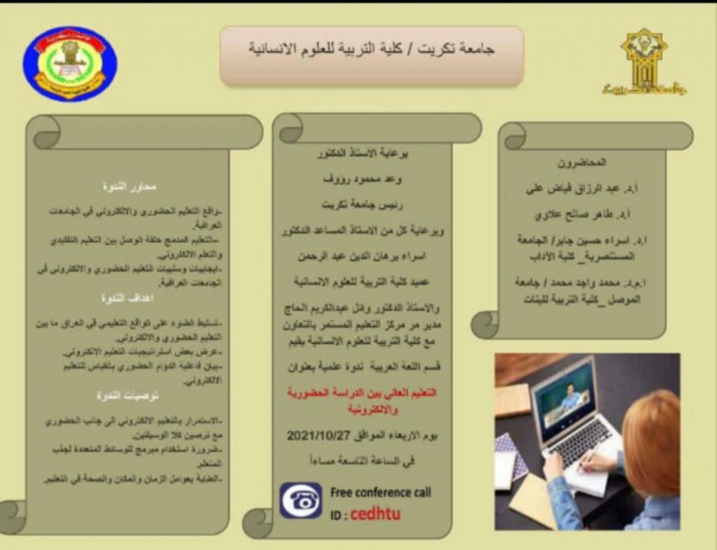 ضمن برنامج التعاون المشترك بين جامعات العراق، شارك الاستاذ المساعد الدكتور محمد واجد مسؤول التعليم الالكتروني في جامعة الموصل، في الندوة العلمية الالكترونية الموسومة بـ”التعليم العالي بين الدراسة الحضورية والإلكترونية” والتي أقامتها كلية التربية للعلوم الانسانية / جامعة تكريت، وذلك يوم الاربعاء الموافق 27 تشرين الاول 2021، وبمشاركة من الجامعة المستنصرية، فضلاً عن جامعة تكريت، تم تقديم ورقة العمل الموسومة بـ”التعليم المدمج حلقة الوصل بين التعليم التقليدي والتعلم الإلكتروني” والتي تناولت: تعريف التعليم المدمج، ومميزاته فضلاً عن المعوقات التي تواجهه، مع توضيح استراتيجيات التدريس المتمركزة حول الطالب، وبيان دور المؤسسة التعليمية والكادر التدريسي فضلاً عن دور الطالب فيه، كما تم تقديم التوصيات الآتية:- تدريب اعضاء هيئة التدريس على استراتيجيات التدريس المتمركزة حول الطالب لأهميتها في زيادة التحصيل الاكاديمي وفي تحسين الدافعية للتعلم .- تدريب اعضاء هيئة التدريس على تطبيق التعليم المدمج لفاعليته عند تطبيق استراتيجيات التدريس.- الاهتمام باستراتيجيات التدريس التي تعتمد على فعالية الطالب وعلى كونه محور العملية التعليمية .- تجربة تطبيق استراتيجيات تعلم أخرى غير المستخدمة في الدراسة ورصد مدي فعاليتها مقارنة بالطرق التقليدية .- تجربة استراتيجيات التعلم المتمركزة حول الطالب في مقررات اخرى ولمستويات و مراحل دراسية مختلفة .- تجربة التعليم المدمج في تطبيق استراتيجيات متنوعة في التدريس.