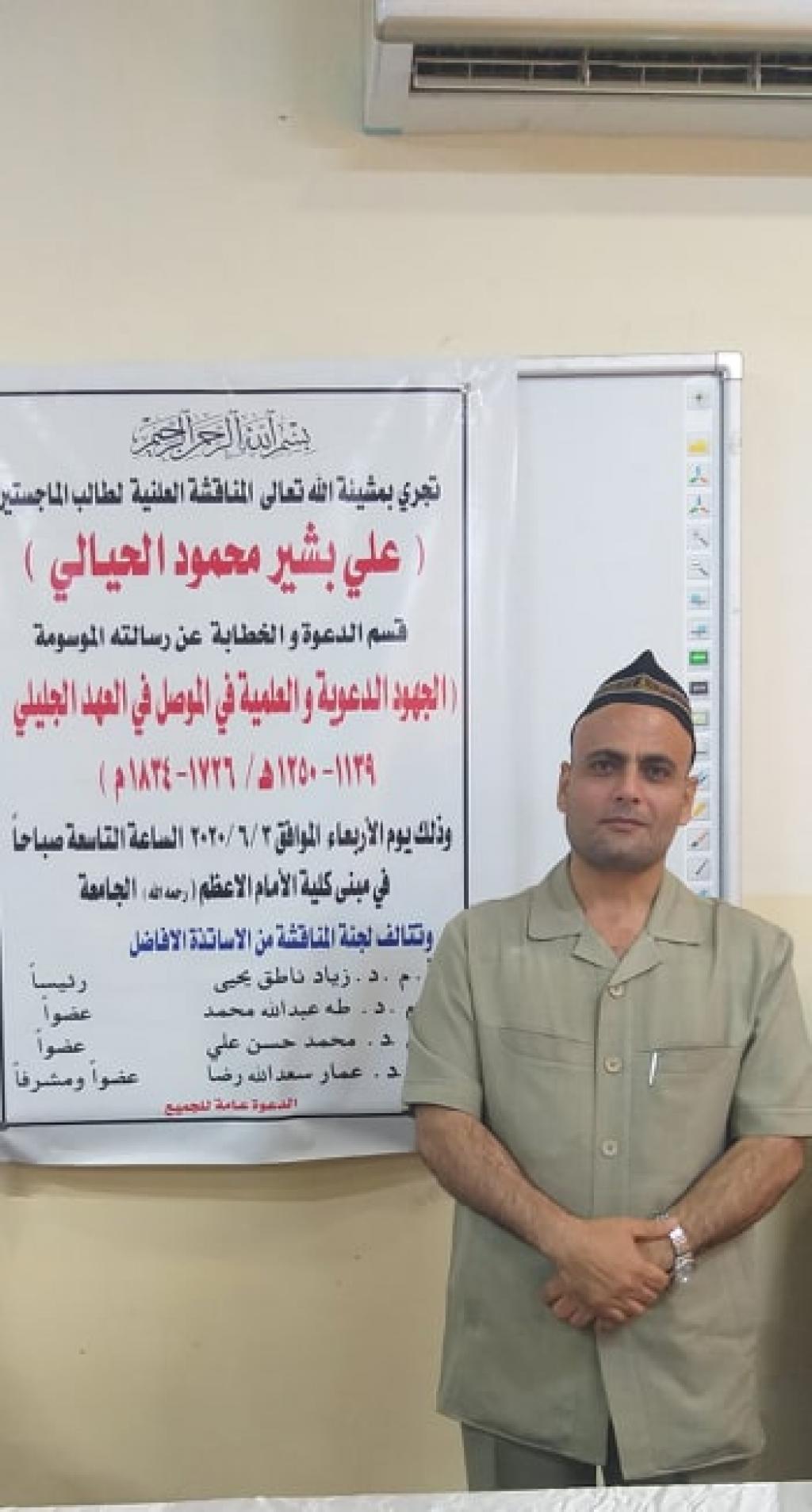 شارك الاستاذ المساعد الدكتور طه عبدالله محمد التدريسي في قسم علوم القرآن والتربية الاسلامية في لجنة مناقشة طالبة الماجستير (علي بشير محمود) عن رسالته الموسومة بـ(الجهود الدعوية والعلمية في الموصل في العهد الجليلي) والتي جرت يوم الاربعاء الموافق 3 حزيران 2020 في قسم الدعوة والخطابة / كلية الامام الاعظم الجامعة.