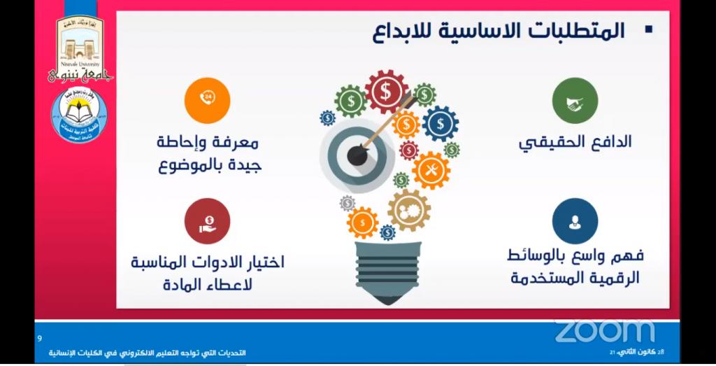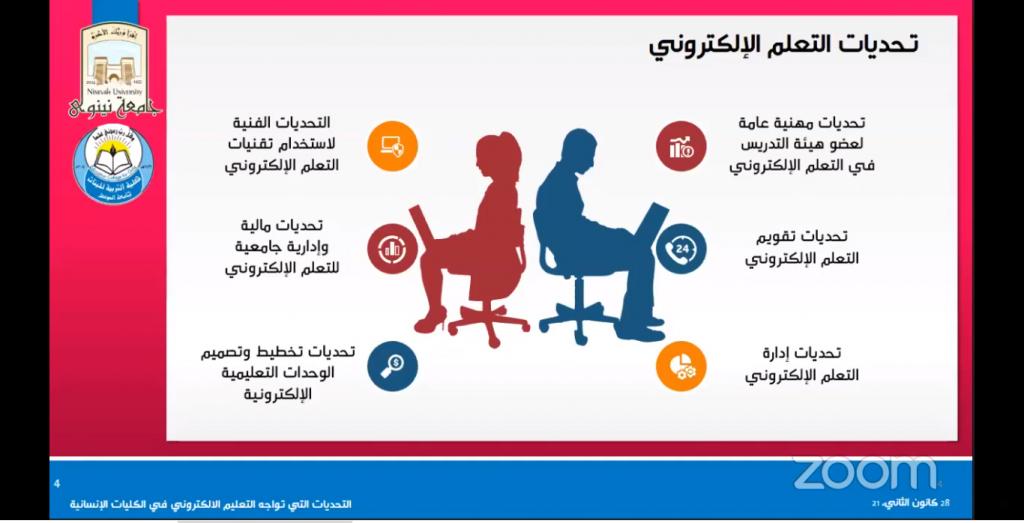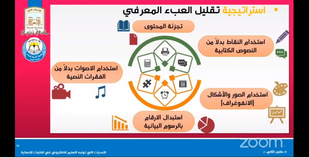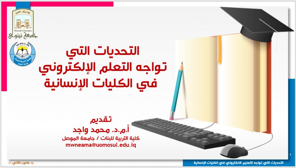 ضمن ساسية كلية التربية للبنات في التعاون العلمي المشترك بين جامعات القطر وتزامنا مع اليوم العالمي للتعليم ونظرا للحاجة الماسة للتطوير وتقييم التعليم الالكتروني، شارك الاستاذ المساعد الدكتور محمد واجد التدريسي من قسم علوم القرآن والتربية الاسلامية في الندوة العلمية العالمية الالكترونية الأولى والموسومة بـ(التعليم الالكتروني إرادة وتحدي)، والتي تمت برعاية معالي وزير التعليم العالي والبحث العلمي الاستاذ الدكتور نبيل كاظم عبد الصاحب، وبتوجيه مباشر من السيد رئيس جامعة نينوى الاستاذ الدكتور أسامة المشهداني، وباشراف السيدة عميد كلية القانون أ. د. زينة العبيدي، وبمشاركة نخبة من أساتذة الجامعات الاقليمية والدولية وعدد من الباحثين، قدّم أ.م.د. محمد واجد ورقته العلمية الموسومة بـ(التحديات التي تواجه التعلم الالكتروني في الكليات الانسانية)، اذ تناول: تحديات مهنية عامة لعضو هيئة التدريس في التعلم الإلكتروني، والتحديات الفنية لاستخدام تقنيات التعلم الإلكتروني، وتحديات تقويم التعلم الإلكتروني، وتحديات مالية وإدارية جامعية للتعلم الإلكتروني، وتحديات إدارة التعلم الإلكتروني، وتحديات تخطيط وتصميم الوحدات التعليمية الإلكترونية، فضلا عن استعراض استراتيجة تقليل العبء المعرفي لجعل الوحدة التعليمية الالكترونية مشوقة وتعرض المادة التعليمية بطريقة ابداعية.