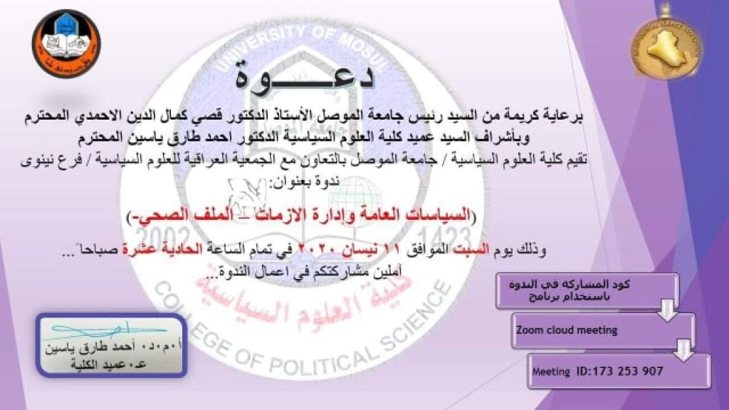 شارك عدد من تدريسيي كلية التربية للبنات في الندوة العلمية الالكترونية الموسومة بـ”السياسيات العامة وإدارة الازمات -الملف الصحي-” والتي جرت يوم السبت الموافق 11 نيسان 2020 برعاية السيد رئيس جامعة الموصل وبالتعاون بين كلية العلوم السياسية والجمعية العراقية للعلوم السياسية / فرع نينوى، اذ شارك الدكتور فؤاد سالم اسماعيل، والدكتور زياد مظفر الراوي، والمدرس حسام مال الله الطائي، في الورشة التي تناولت كيفية ادارة الأزمة للملف الصحي.