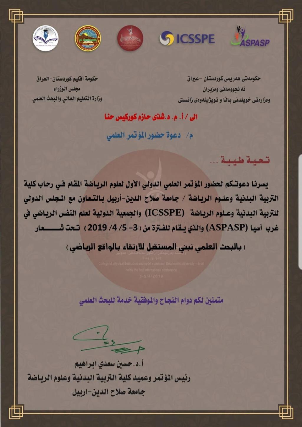 مشاركة معاون العميد للشؤون الادارية في المؤتمر الدولي الاول في كلية التربية البدنية وعلوم الرياضة في جامعة صلاح الدين / اربيل